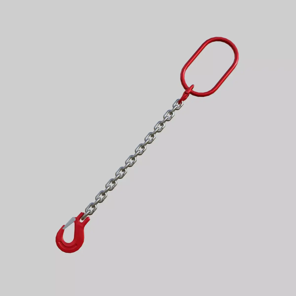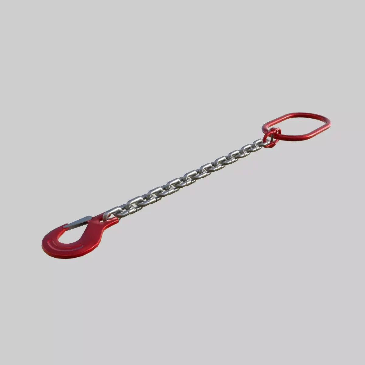 This model accurately represents a steel chain with a reinforced red alloy hook and master link, commonly used for hoisting loads in crane operations, foundries, and mechanical handling systems.