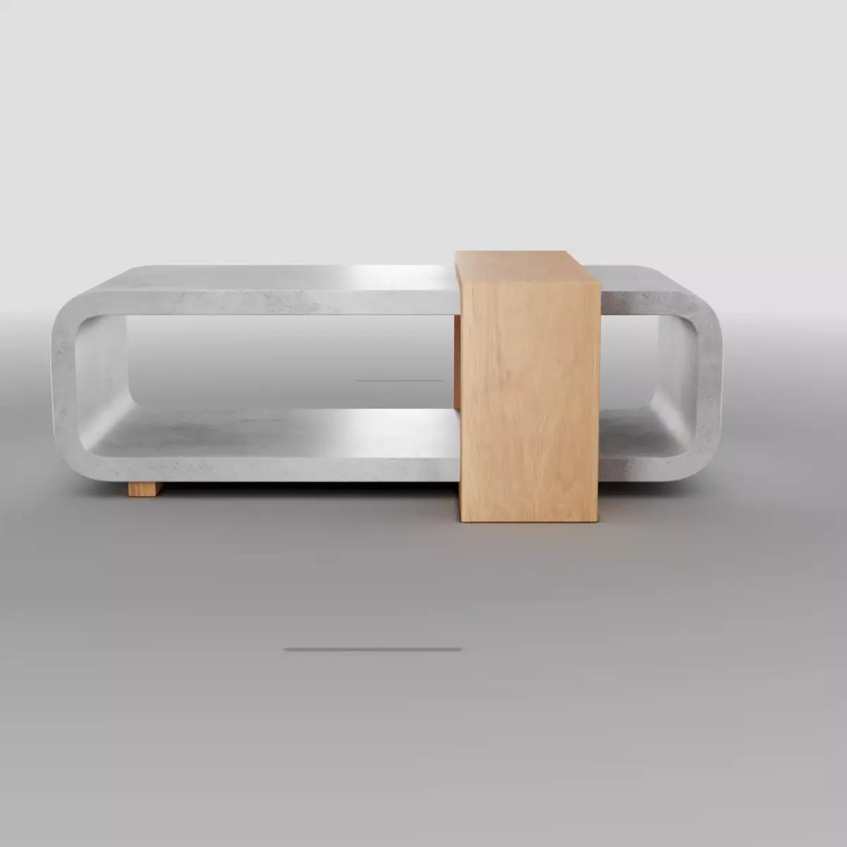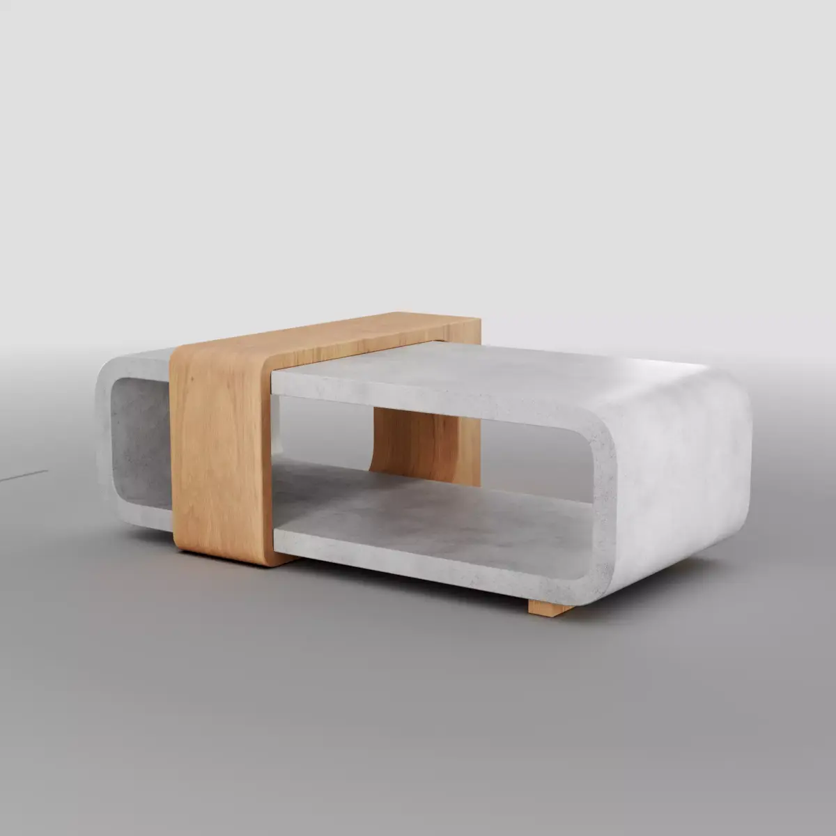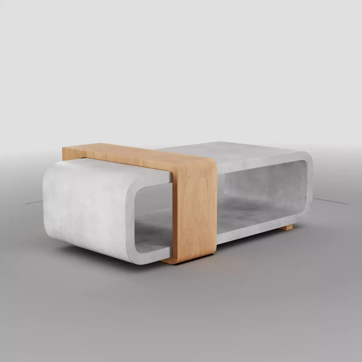 Elevate your interior scene with this contemporary sculptural coffee table that blends raw concrete aesthetics with warm natural oak. Designed with a seamless flowing form, the table features two hollow U-shaped concrete volumes intersected by a smooth solid oak frame, creating a striking balance between industrial strength and organic warmth.