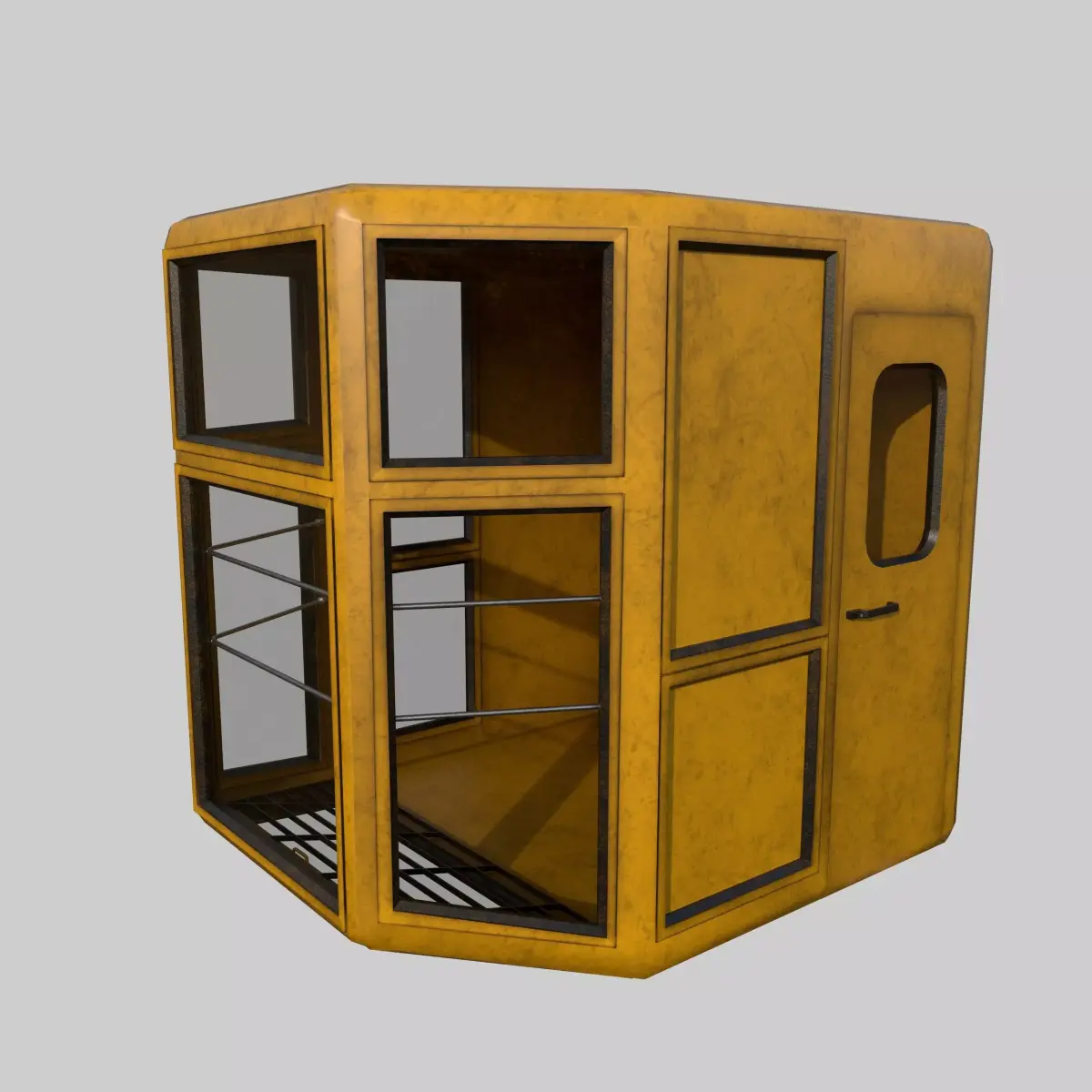 This cabin features sturdy metal framing, transparent glass panels, and reinforced interior supports, accurately representing real-world crane cabins used in steel plants, foundries, and industrial sites.