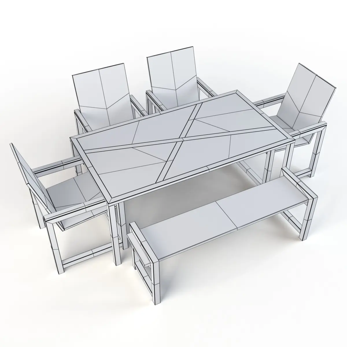 The chair is 640 x 717 x 1047 The table is 965 x 1800 x 762The bench is 450 x 1645 x 542