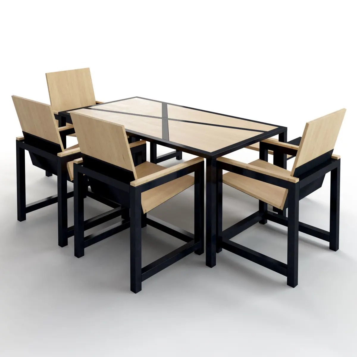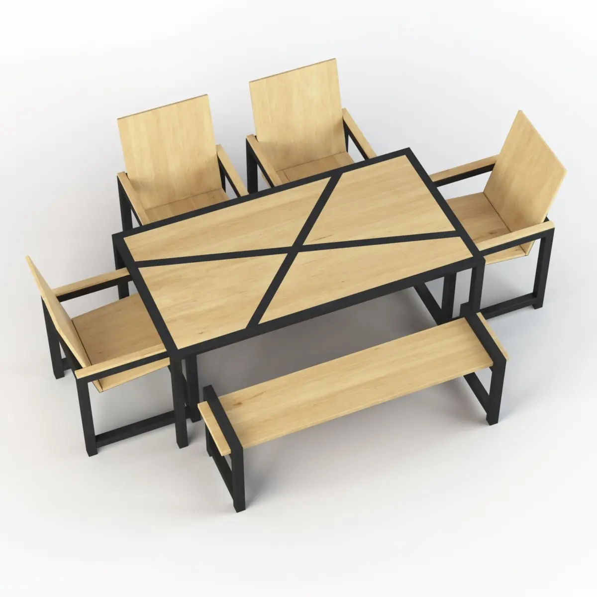 This is a Dining Set with an industrial touch.It is a perfect match for a pizza restaurant or a burger house.It is made from construction beams of 50x30 and 50x50 mm.The wooden board of the table and bench is 30 mm, and boards of the chairs are 20 mm thickness.