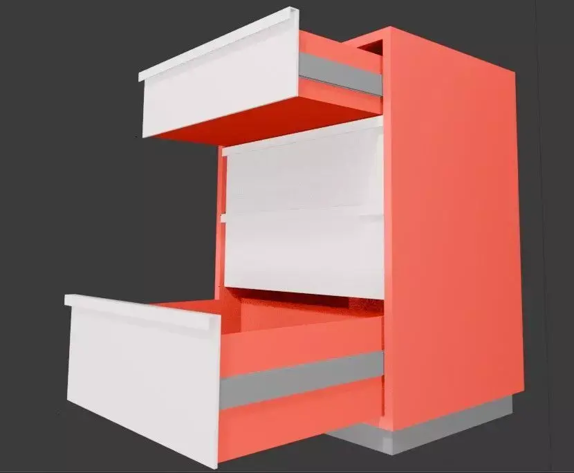 The cabinet includes three fully independent drawers, each modeled as a separate object with correctly positioned pivot points. This makes the model ideal for animation, rigging, or interactive applications where drawer movement is required.