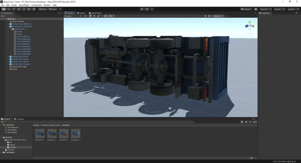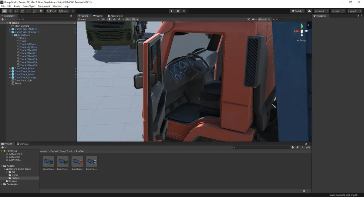 Realistic Dump Truck pack for the game engine Unity3d, it has openable doors and wheels are separated inside the mesh with propper pivot, it has PBR textures splitted in three materials, truck, dump and glass, truck textures have a resolution of 4096x4096, dump textures have a resolution of 2048x2048 and glass texture have a resolution of 512x512,