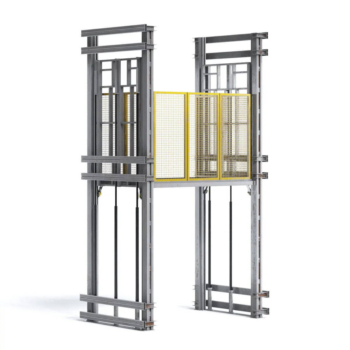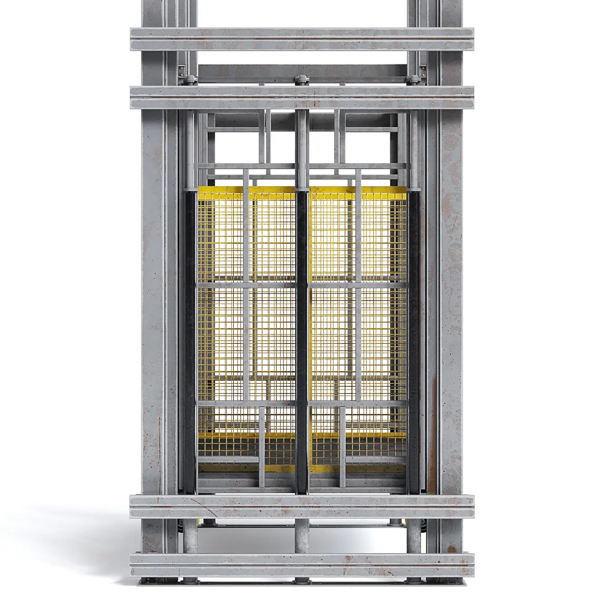Two story pneumatic industrial elevator lift with slitghy scratches and rust.