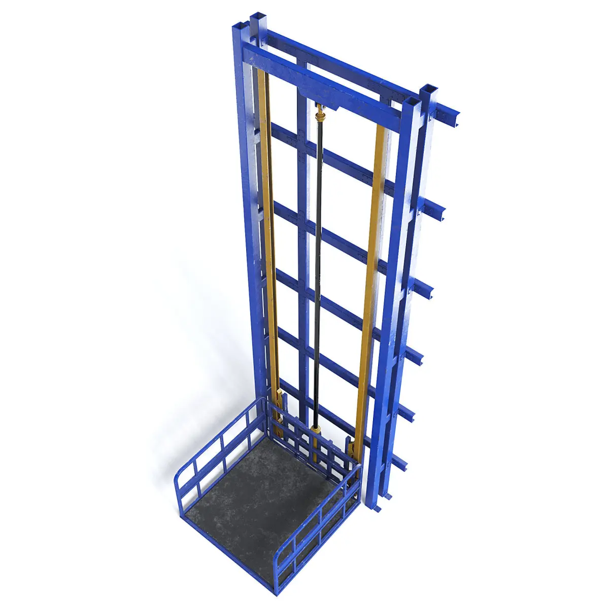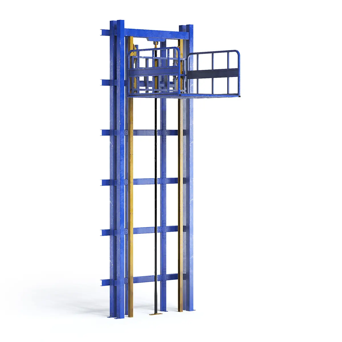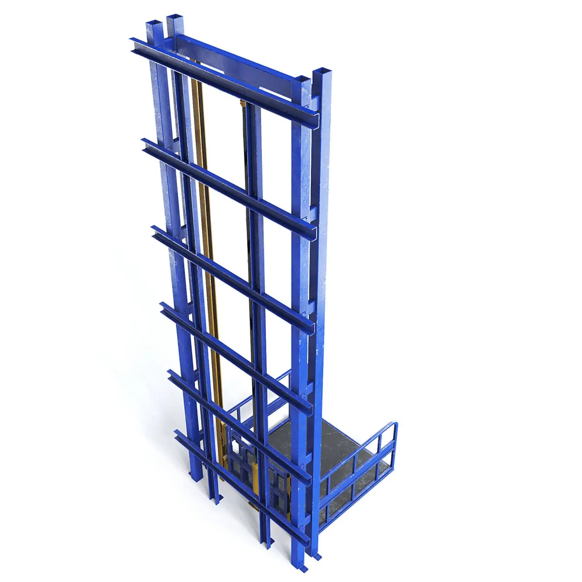 Blue industrial hydraulic elevator lift with slitghy scratches.