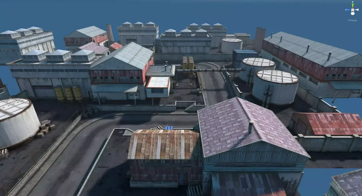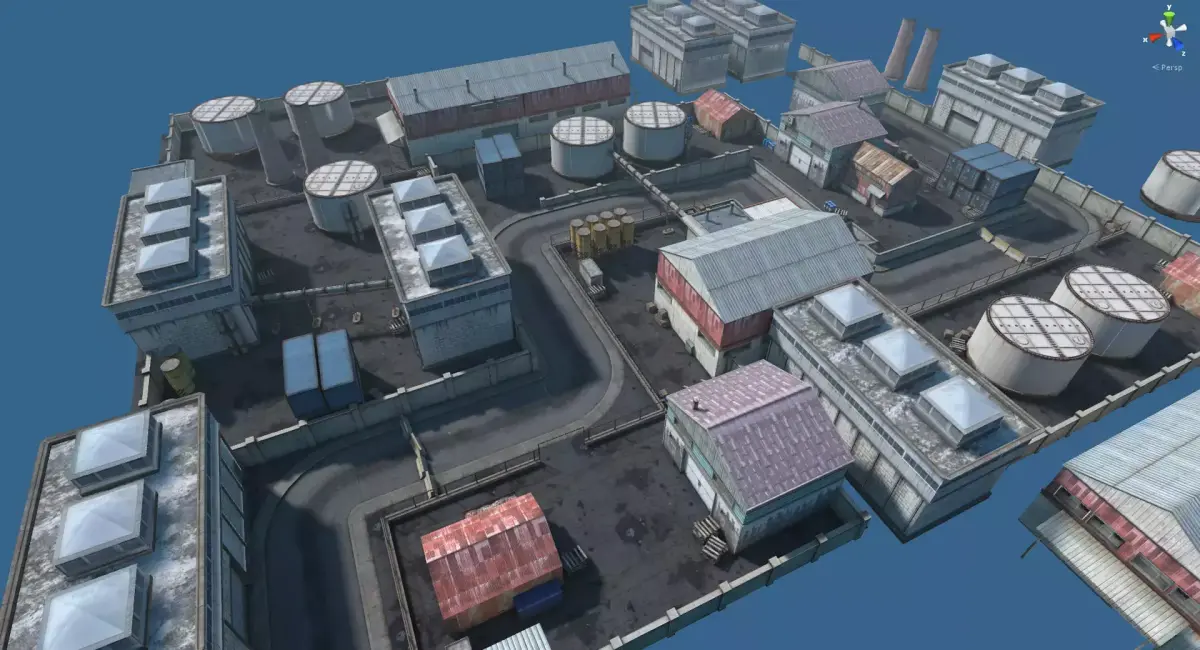 Optimized industrial environment map designed for games, simulations, and real-time projects. Modular buildings, tanks, warehouses, roads, and props arranged into a complete playable layout. Suitable for FPS, racing, and open-area exploration.