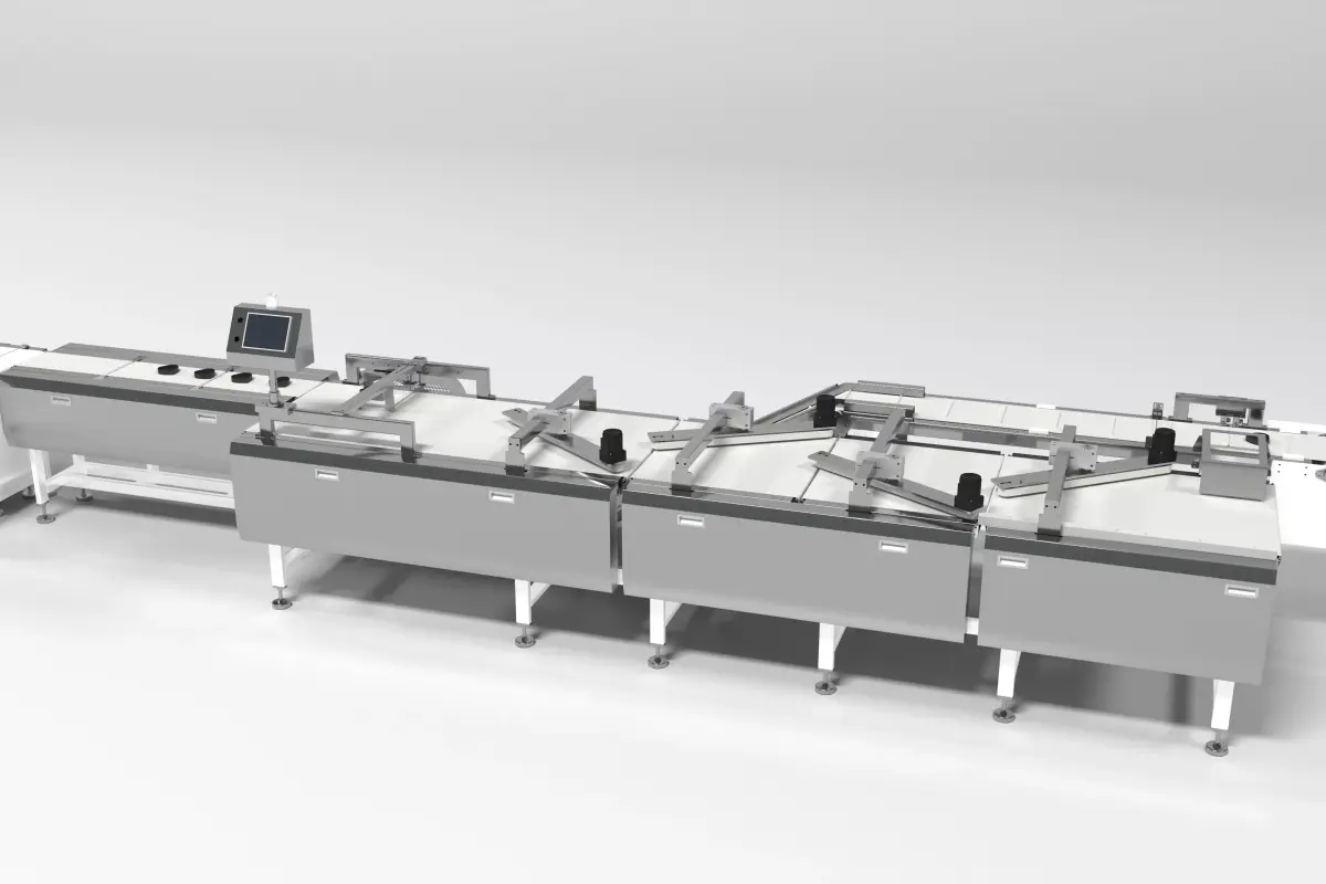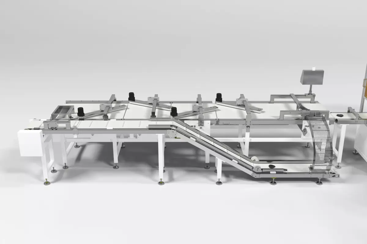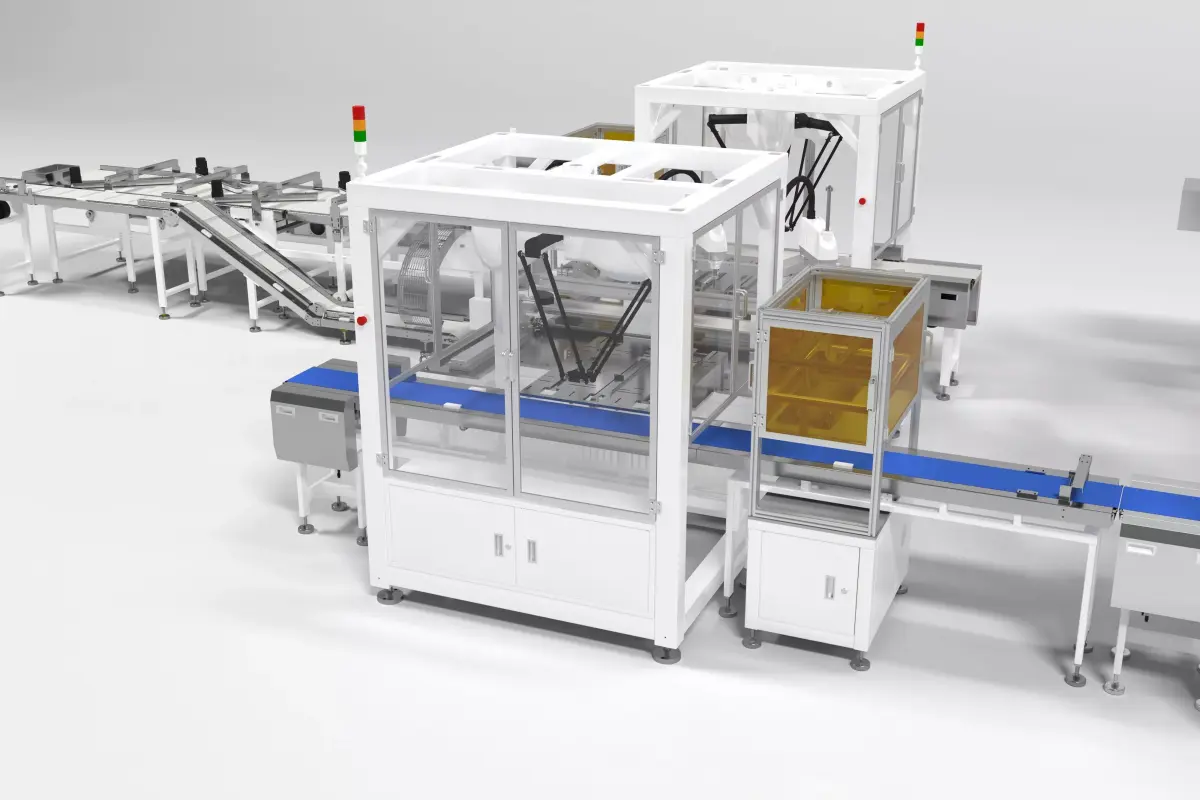 This is a 3D rendering of an automated production line, laid out in a long, linear flow with multiple modular units connected in series. The equipment features white frames, transparent safety enclosures, blue conveyor belts, and yellow protective guards, with robotic arms and operating units at each station to carry out continuous processes such as material handling, automated assembly/sorting, inspection, and packaging. Tri-color indicator lights on top of each unit monitor operational status, showcasing the efficient and intelligent characteristics of industrial automated production.