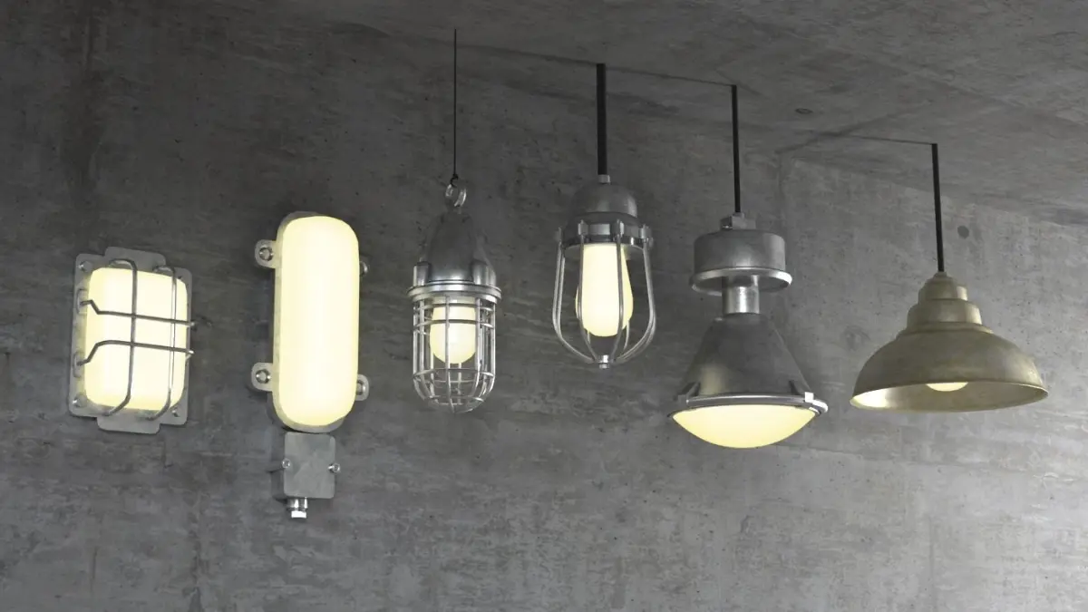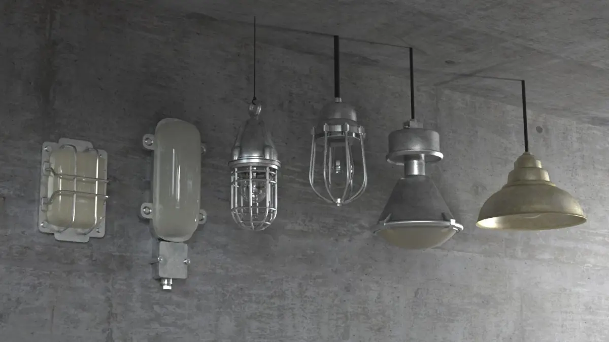 Six lights in varying styles as one might expect to see in an old factory or down town hipster bar.