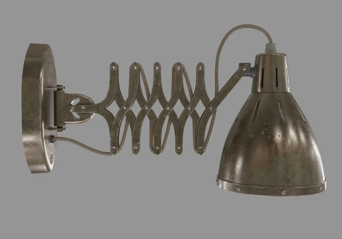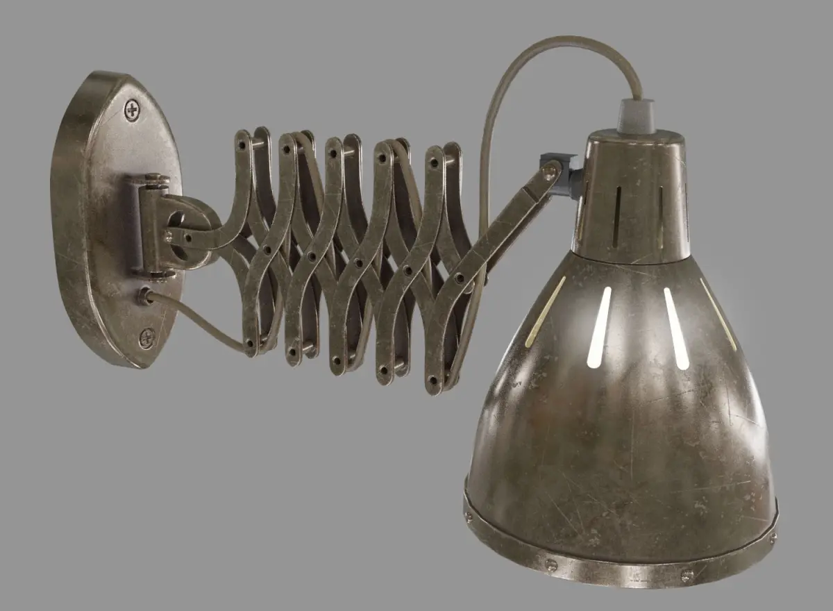 This is a folding wall lamp that has an industrial look and style. As you can see in the pictures, the main model is closed, also there is an example of the model in the open state as an example. But you can open and close the model according to the joints and arms or rotate its head around its axis I made this model in 3D Max and UV mapping it in Unfold3D and rendered in Blender. It also has a 4K PBR textures.