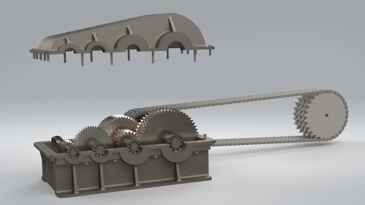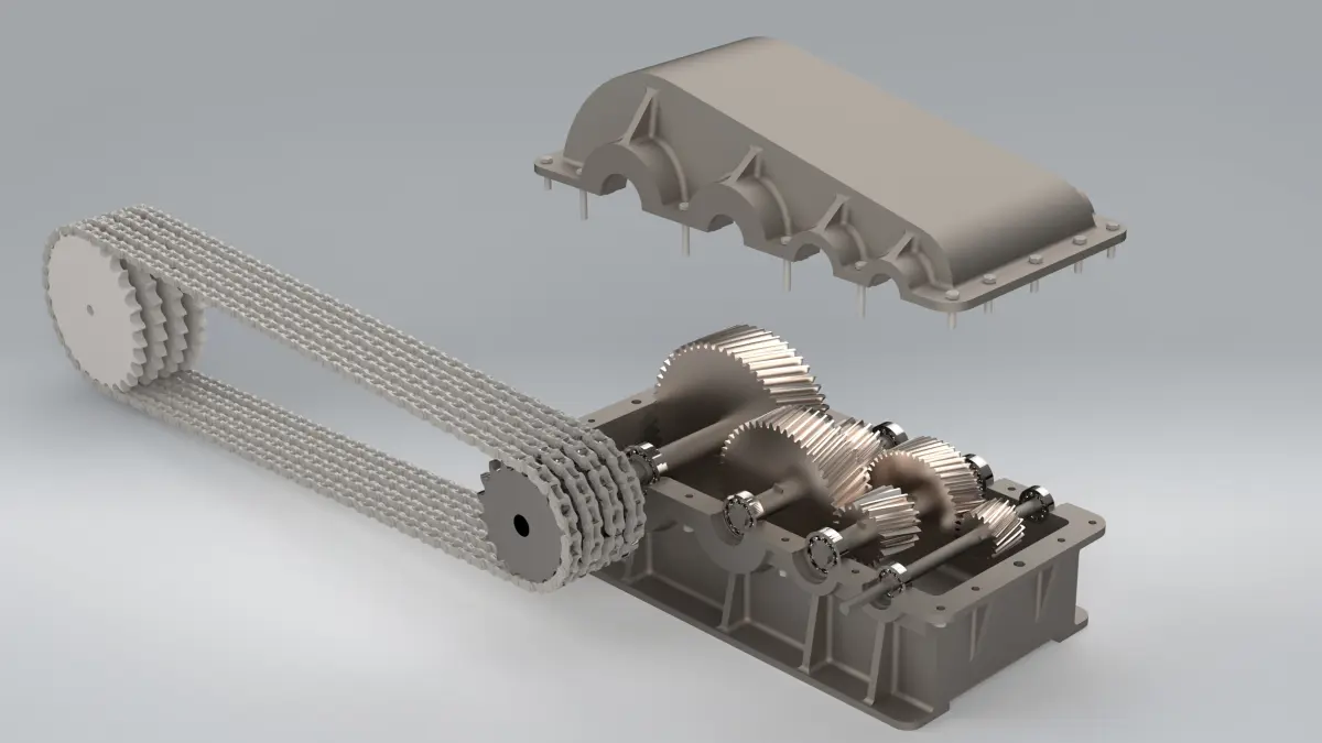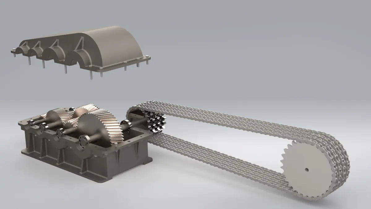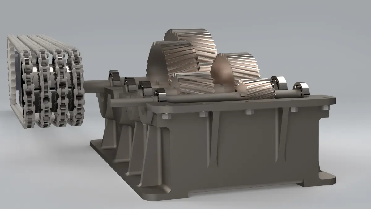 This high-quality 3D model represents an industrial gearbox assembly with integrated chain drive, meticulously designed in SolidWorks 2023. The model includes all internal components such as helical gears, shafts, bearings, and housing, as well as a detailed transmission chain system.