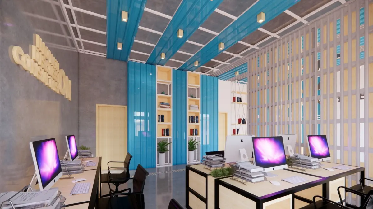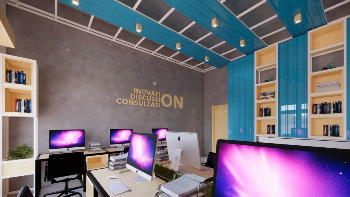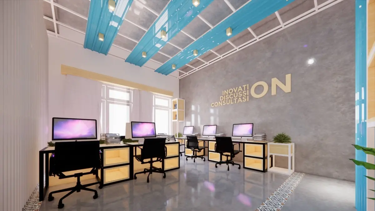 This interior design uses materials derived from mild steel to produce an industrial design but still prioritizes user comfort in using space. The dominant blue color gives the impression of being bright but still calm. Dominated by the natural color of mild steel and dominated by white, it produces a calm design.