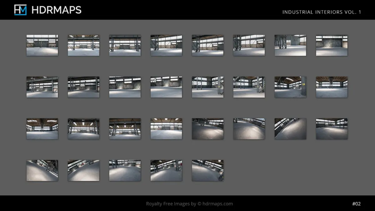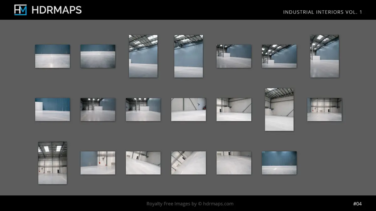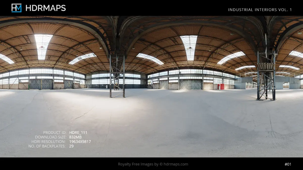 The Industrial Interiors vol. 1 bundle from HDRMAPS is a collection of 10 high-dynamic-range imaging (HDRI) environment maps, accompanied by matching backplates, capturing various industrial settings such as storehouses, garages, and studios.