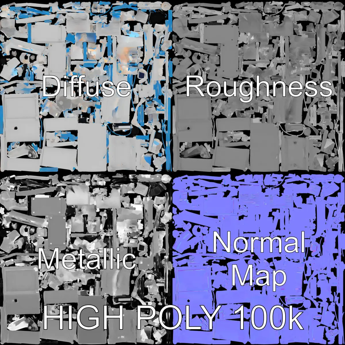 This high-quality 3D Industrial Machine with Cables model pack offers detailed designs perfect for various uses. The model comes in three levels of detail, catering to mobile applications, environmental rendering, and production-quality outputs. It's ideal for simulations, engineering visualizations, or industrial-themed game environments. The PBR textures ensure realism with Diffuse, NormalMap, and reflective/roughness/metallic options at 4096x4096 resolution. The model is efficiently unwrapped with no overlapping UVs, ensuring superior quality. The first image is the reference used for creating the 3D model. It is important to carefully evaluate the quality of the model by examining the preview images that display the topology and polygonal mesh. These previews (WIRE and WEB 3D Preview) clearly demonstrate how accurately the model matches the original reference and how well the geometry has been executed. Please like and leave a comment if you enjoy this model.