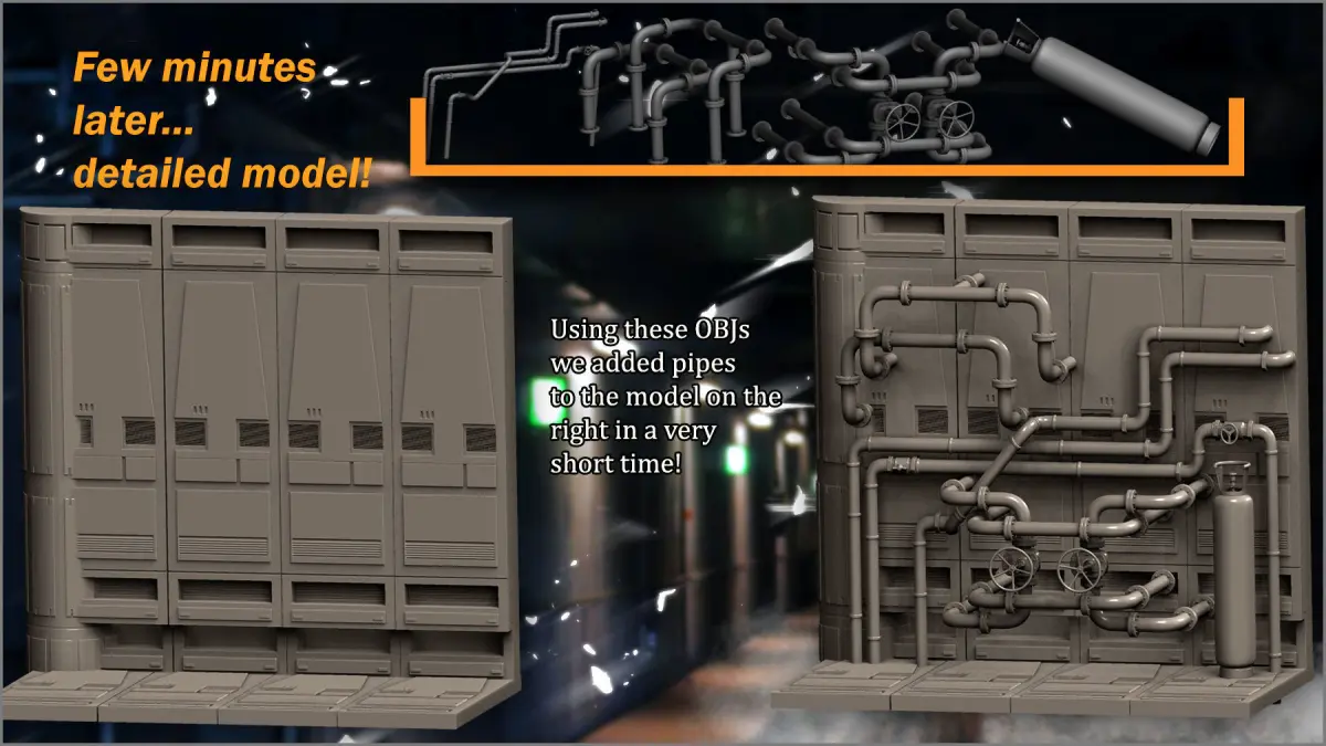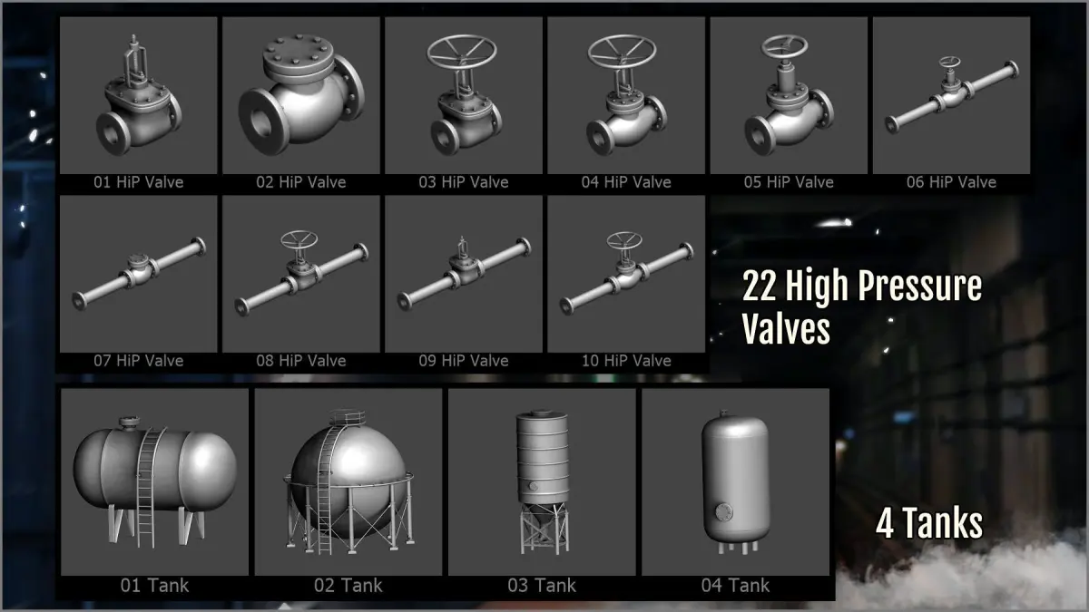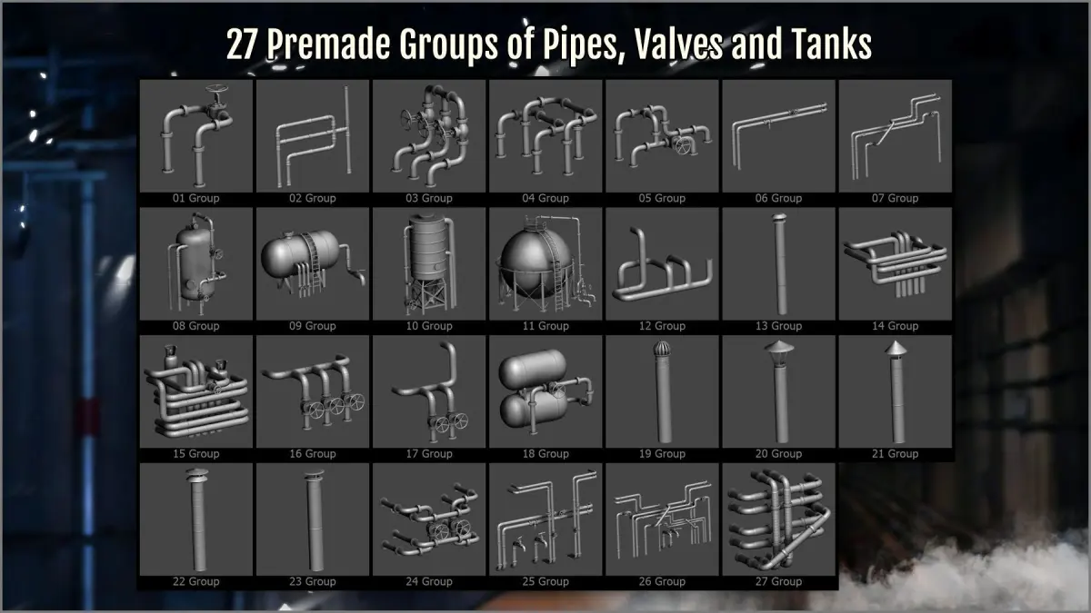 Industrial Maker is a complete pack of OBJs for any 3D app, and ZBrush brushes, for building industrial and sci-fi scenes. It includes tanks, gas bottles, valves, and several kinds of pipes and accessories, from corrugated to industrial, copper, iron, and high pressure, and other pieces.