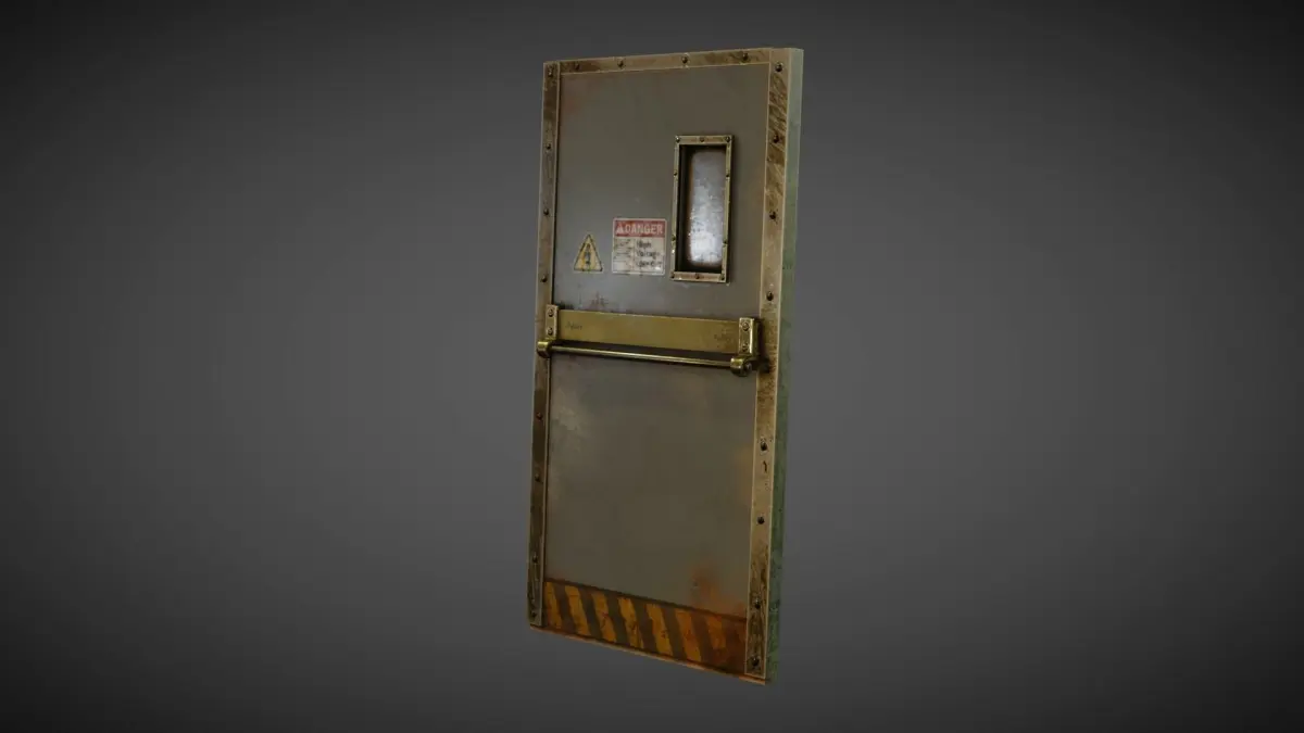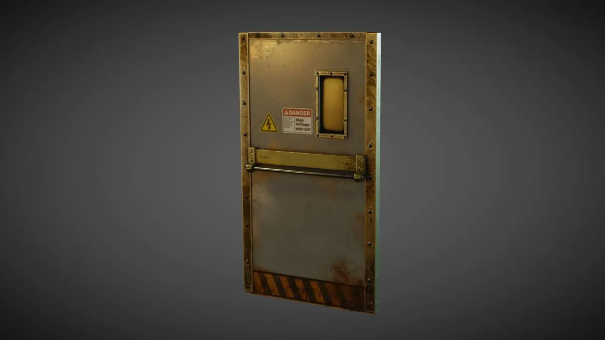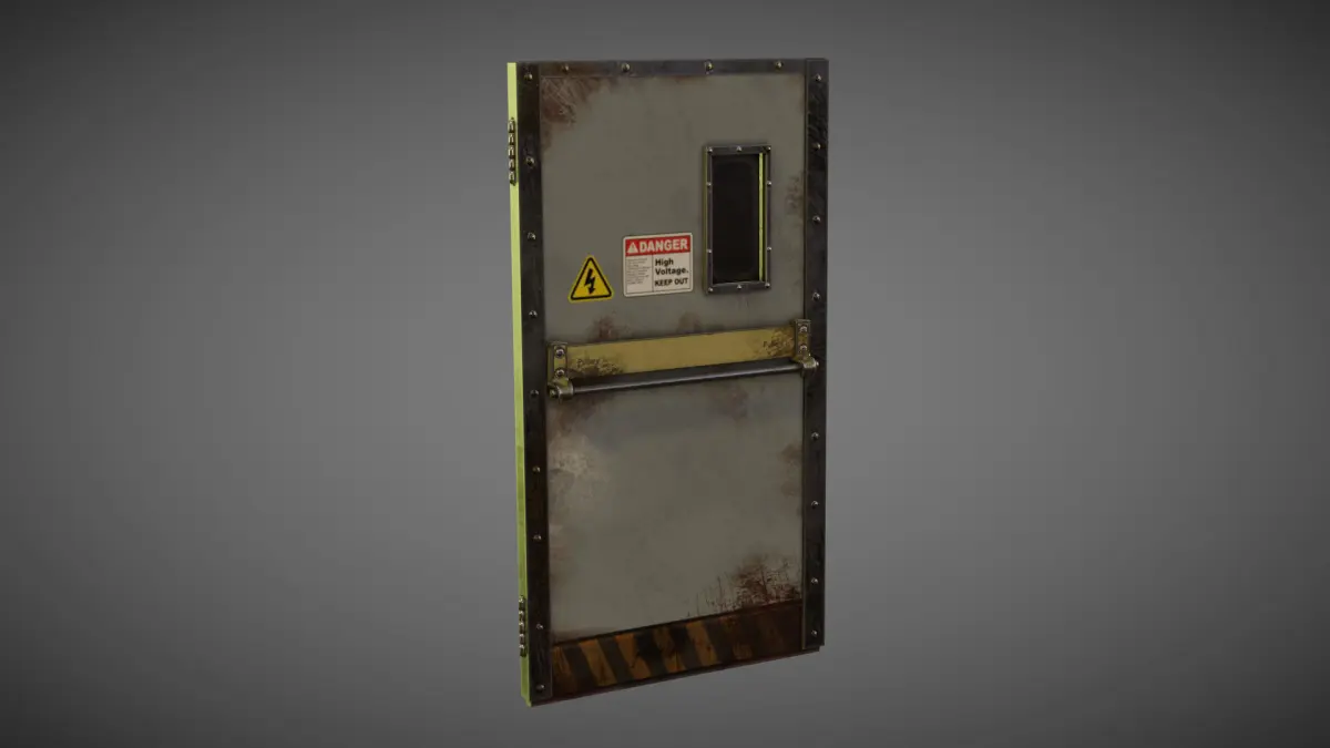 This is a PBR Version of an Industrial Metal Door which includes a handle, metal Planck and a small window