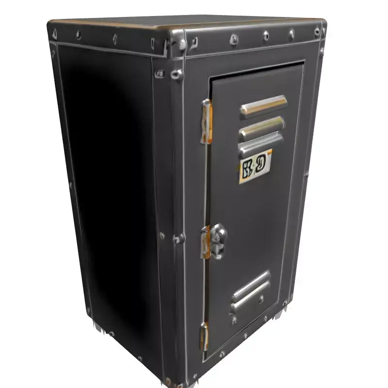 Presenting a meticulously crafted 3D model of an industrial-style metal locker, perfect for adding authentic detail to various digital environments. This model features a distressed grey finish with realistic wear and tear, including subtle rust accents and scuffs, providing a truly weathered and used aesthetic. Key details such as visible rivets along the edges, functional ventilation slats on the door, and a distinct numerical label '1851' enhance its realism. It stands on four sturdy legs, capturing the robust nature of real-world industrial storage units.