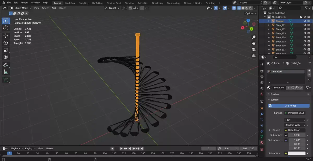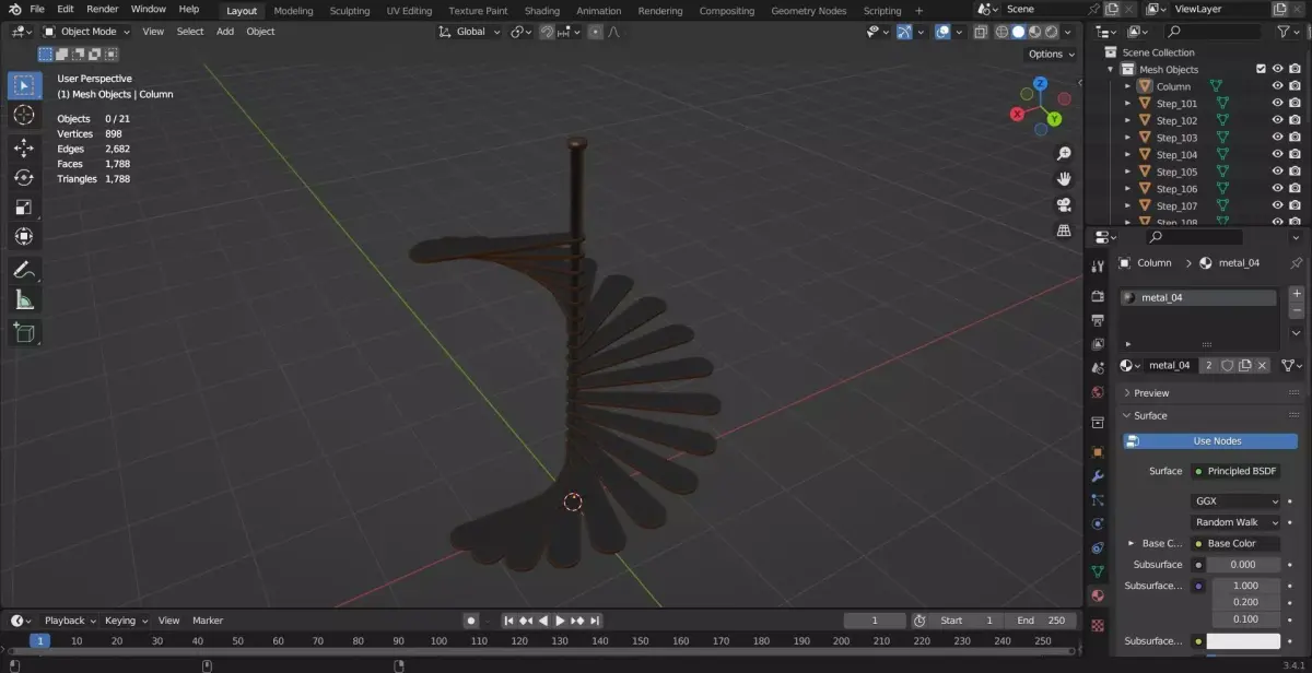 This industrial metal spiral staircase is designed with a strong and realistic structure, suitable for architectural visualization, games, and cinematic scenes. The model was initially created in SketchUp and refined in Blender 3.4, where high-quality PBR textures were applied to achieve a realistic metal surface.