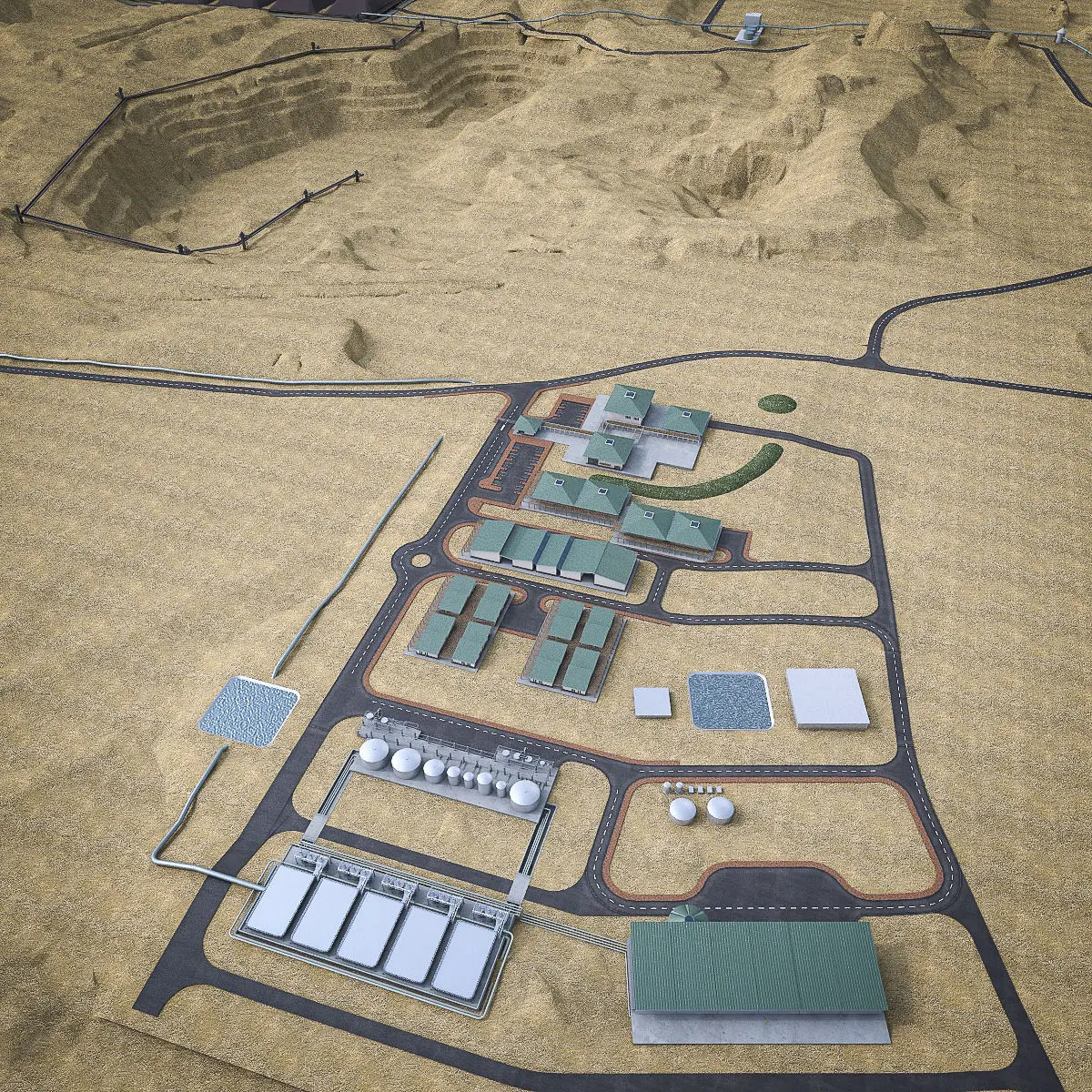 This is a model of real world industrial mining complex in desert, with open pits and mining equipment. Mesh is low-poly where is possible, allows you to easily build up the additional details, edit geometry. Product dimensions: 2,5km x 2,5km x 0,2km Originally created with 3ds Max 2011