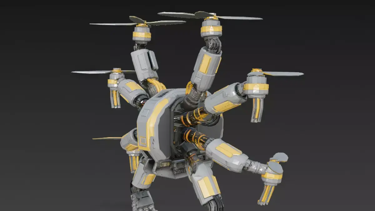 Description:A complex and powerful industrial drone equipped with six mechanical arms featuring integrated flight propellers, along with two functional manipulation arms.