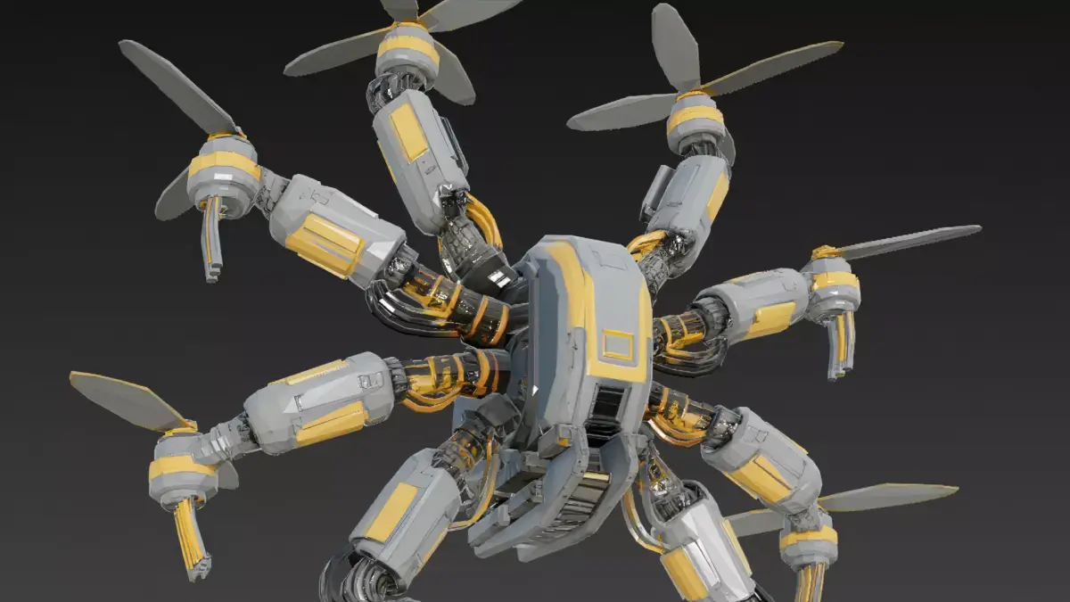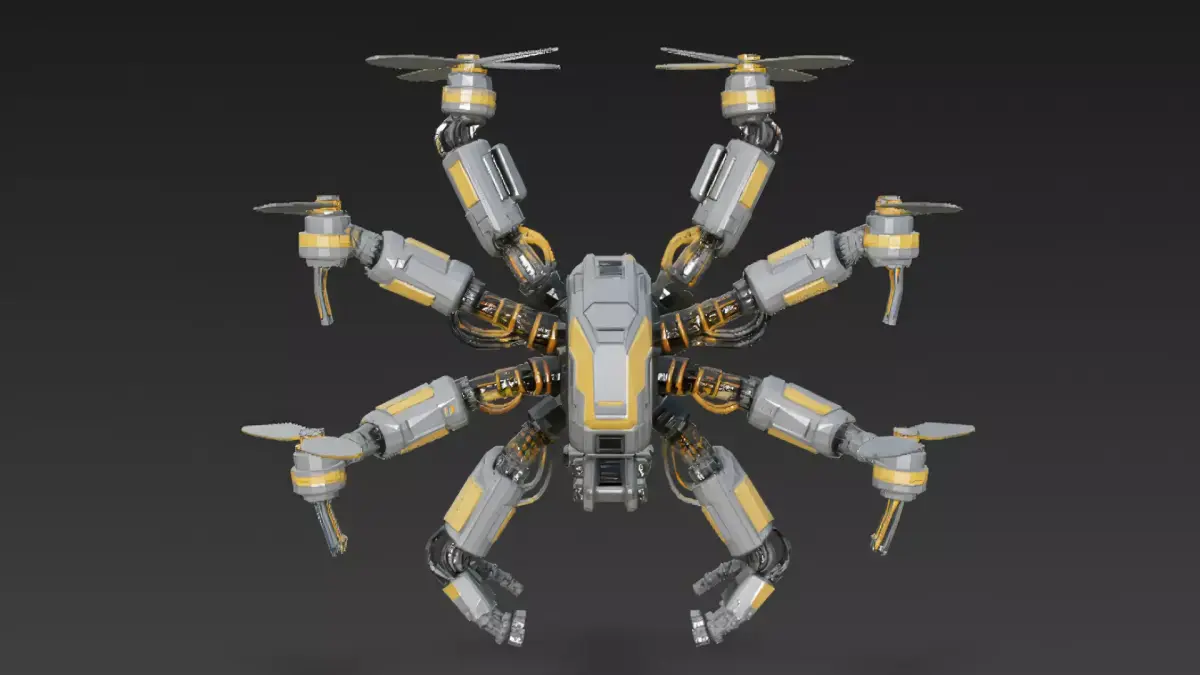 The multi-arm structure gives the drone a strong mechanical presence, making it ideal as a centerpiece asset for factories, cyberpunk worlds, or advanced industrial scenes. Its design balances realism with a bold sci-fi aesthetic.