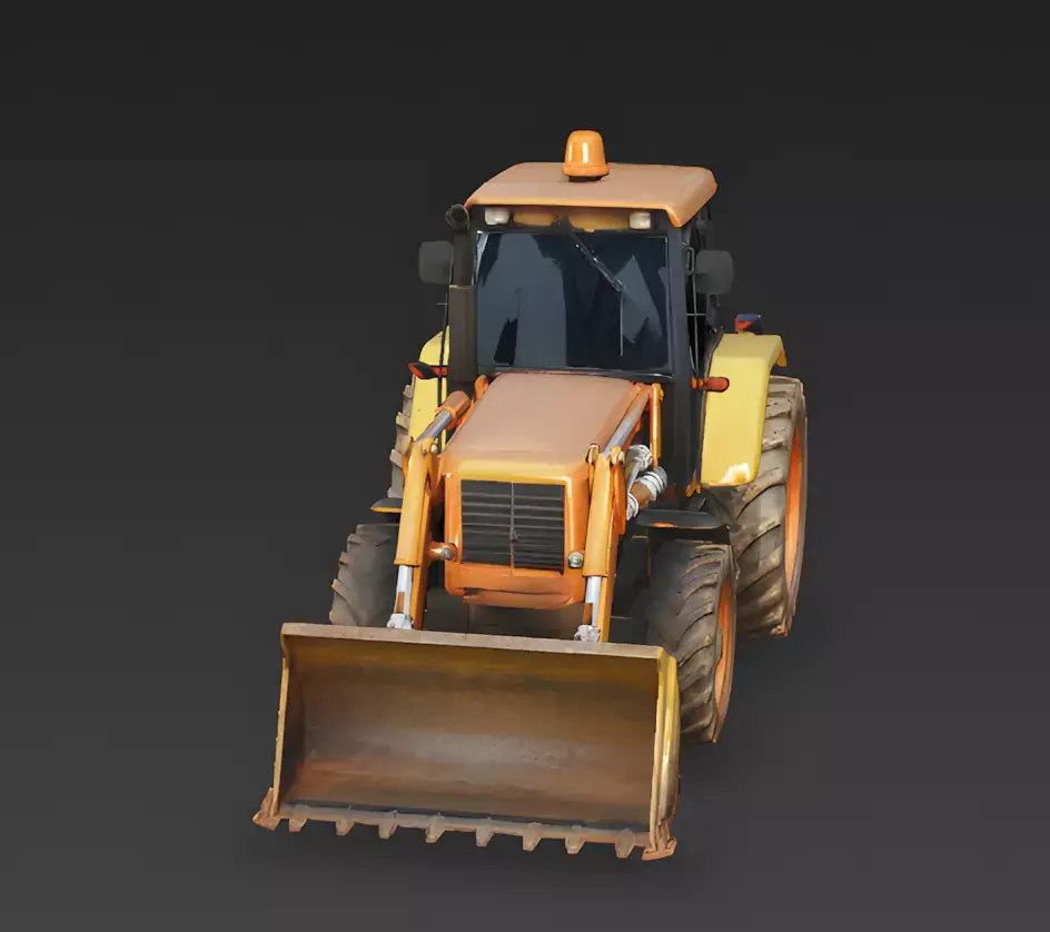 Front Loader Bucket Attached to the front is a large, wide metal scoop (bucket). The inside of the bucket is worn and rusty, showing that it has been used to scrape concrete or move heavy rocks, adding a layer of realism to the asset.