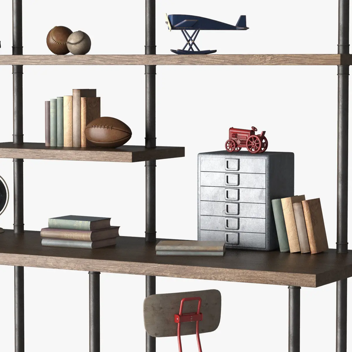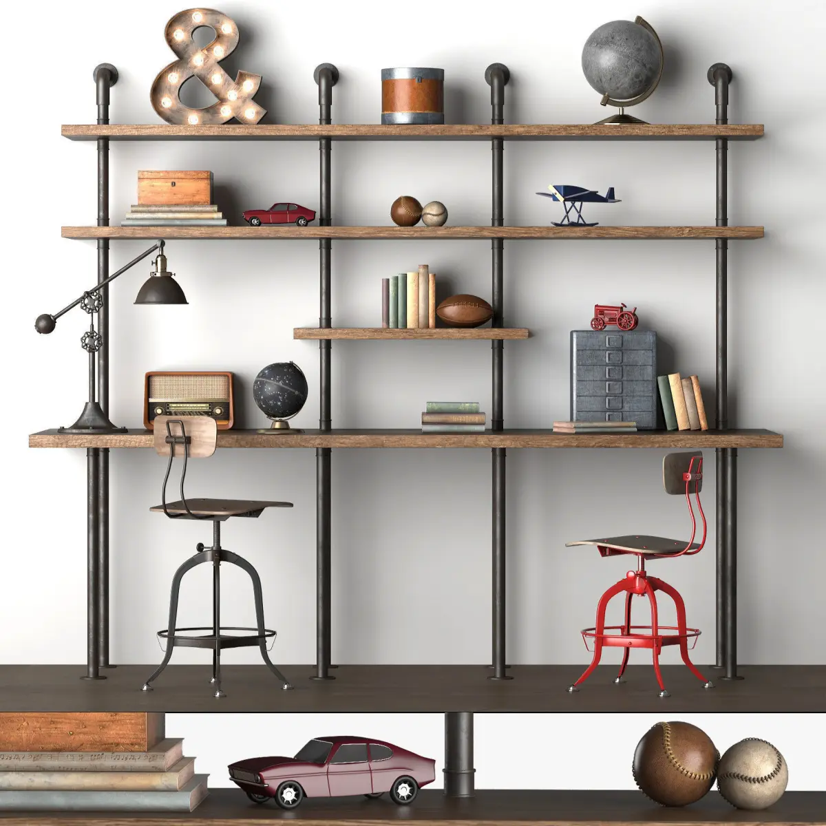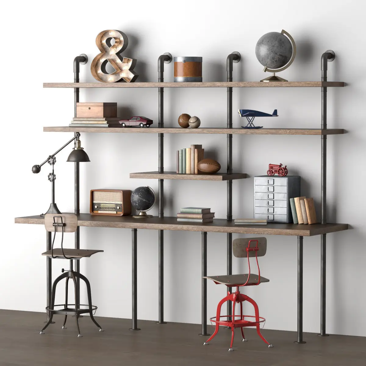 Name: INDUSTRIAL PIPE DOUBLE DESK WITH SHELVINGhttps://www.rhbabyandchild.com/catalog/product/product.jsp?productId=rhbc_prod405203&categoryId=rhbc_cat377425Version: 2013Preview: YesUnits: MillimetersDimension: 2439.87 x 1075.17 x 2222.61Polys: 470,757XForm: YesBox Trick: YesModel Parts: 40Render: V-Ray, CoronaFormats: 3Ds Max 2013, FBX, 3DSATTENTION!Who works in the V-Ray version is lower than 3.1; be careful, in some materials in the BRDF section there is a Microfaset GTR (GGX), if your version is older than 3.1, thenBRDF field will be blank. Choose Blinn, Phong or Ward - which is preferable to you.