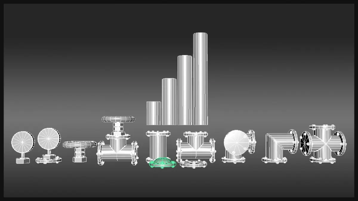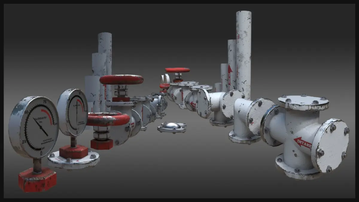 A collection of 15 individual models that can be remixed together to form a wide variety of industrial piping setups. Models are designed to fit believably in any projects involving worn or used industrial machinery, workshops, or garages.
