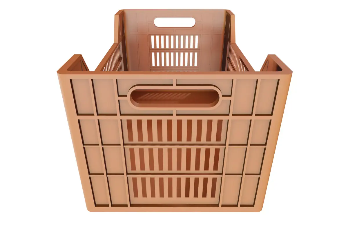 The model features a distinct terracotta orange finish with a realistic plastic texture, accurately capturing the material's matte sheen and molded details. Its functional design includes structural reinforcing ribs, ventilated grid sides for airflow, and a lowered front profile, specifically designed for easy access and product visibility when stacked on shelves.