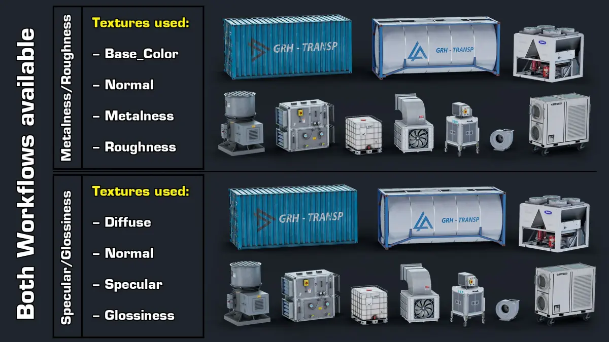- Both Metallic/Rough and Specular/Gloss PBR workflows are available
