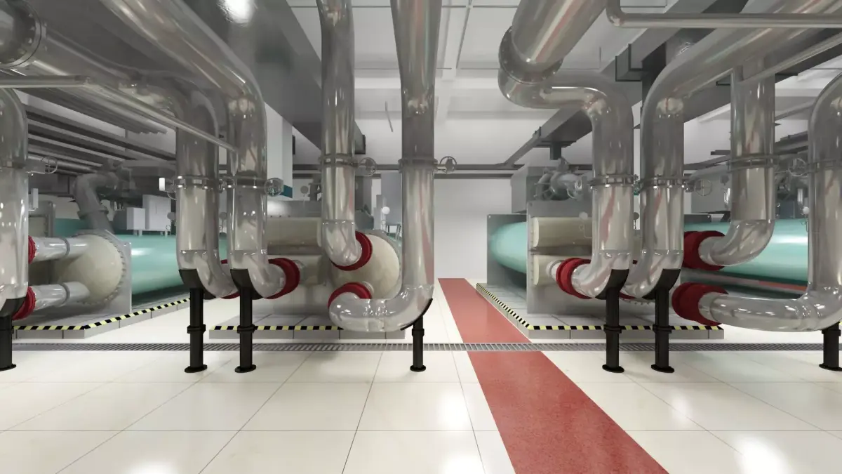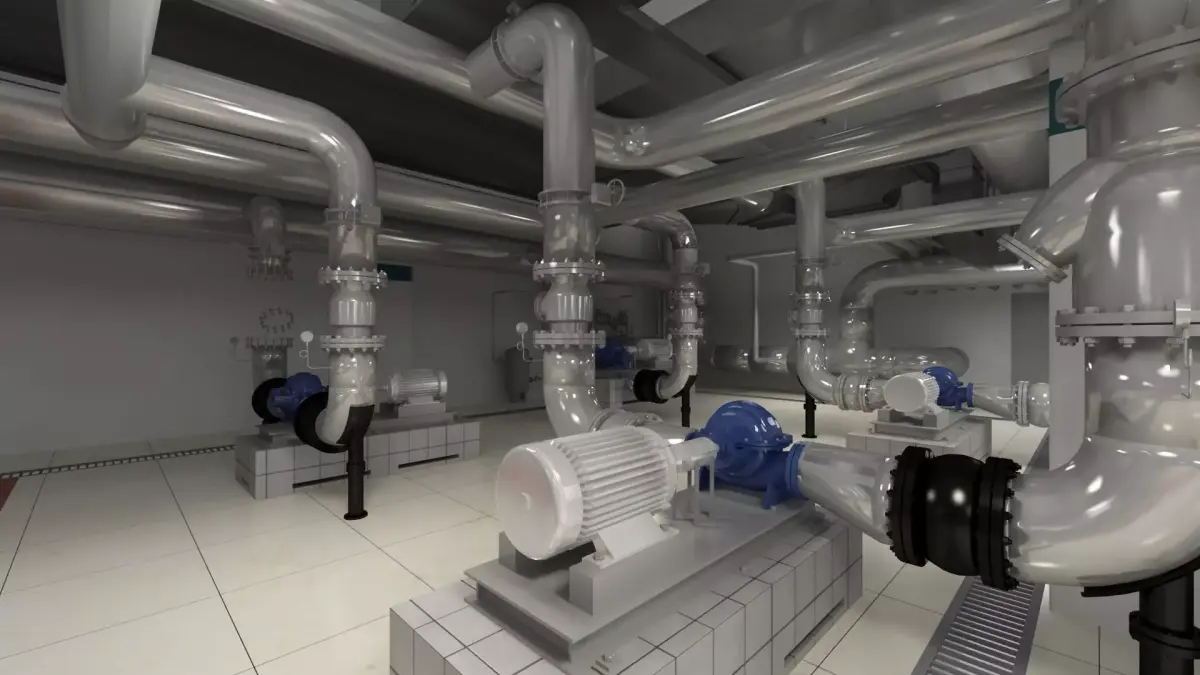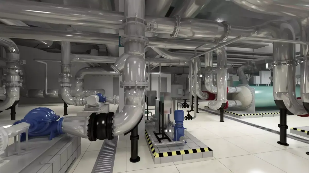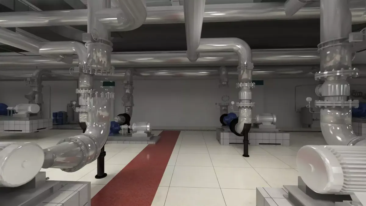Industrial pump department with various engineering models: electric pumps, valves, vents, storing tanks, measuring equipment, pipes, regulating knobs, screws and nuts.Room size: 44x44 m.