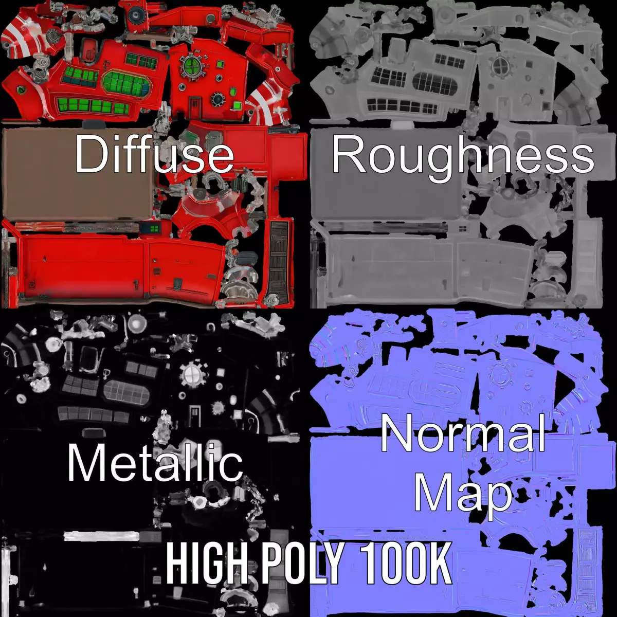 This Industrial Red Factory model pack features a vibrant, steampunk-inspired factory structure with striking red surfaces contrasted by green windows and metallic details. Each model has 3 levels of detail: low-poly (1000 triangles for mobile), middle-poly (10,000 triangles for environment), and high-poly (100,000 triangles), which allows for the use of this model in production rendering (such as 3ds Max, Maya, Cinema4D, Blender, Vray/Corona/Cycles and all others), game engines (Unity and Unreal compatible), and interactive presentations, providing a choice of detail based on the LOD System principle. Ideal for usage in game design, animations, and simulations, this model will add an industrial element to any scene. The model's textures are PBR, Diffuse, NormalMap, and reflection/roughness/metallic, which are suitable for any modern rendering engine. All models accurately unwrapped and have no overlapping UVs. Like and comment if you find this model useful! All textures are 4096*4096 in size.