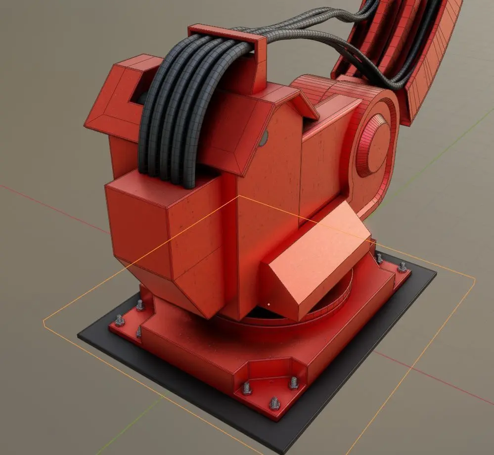 This is the high-poly version of the industrial robot arm.The model has no textures, but procedural shader materials for Blender-3D.