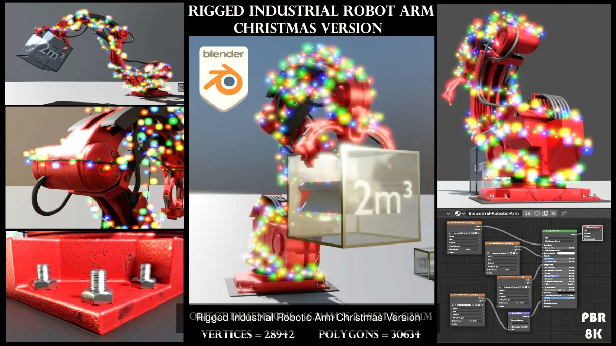 Here is the low-poly version of the industrial robot arm as christmas version. Created for and tested in our 2023 Christmas Video.