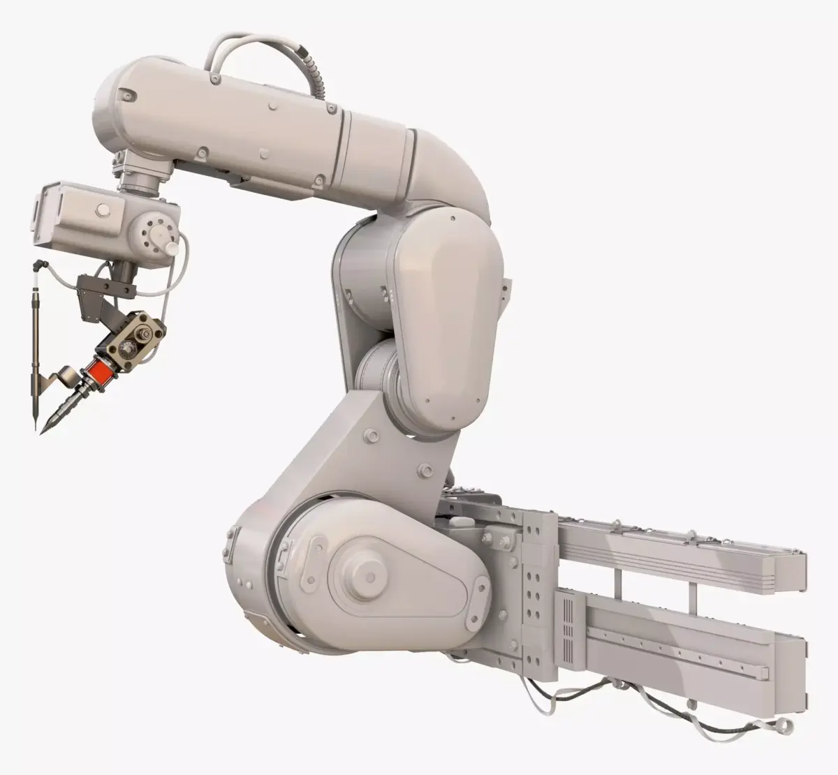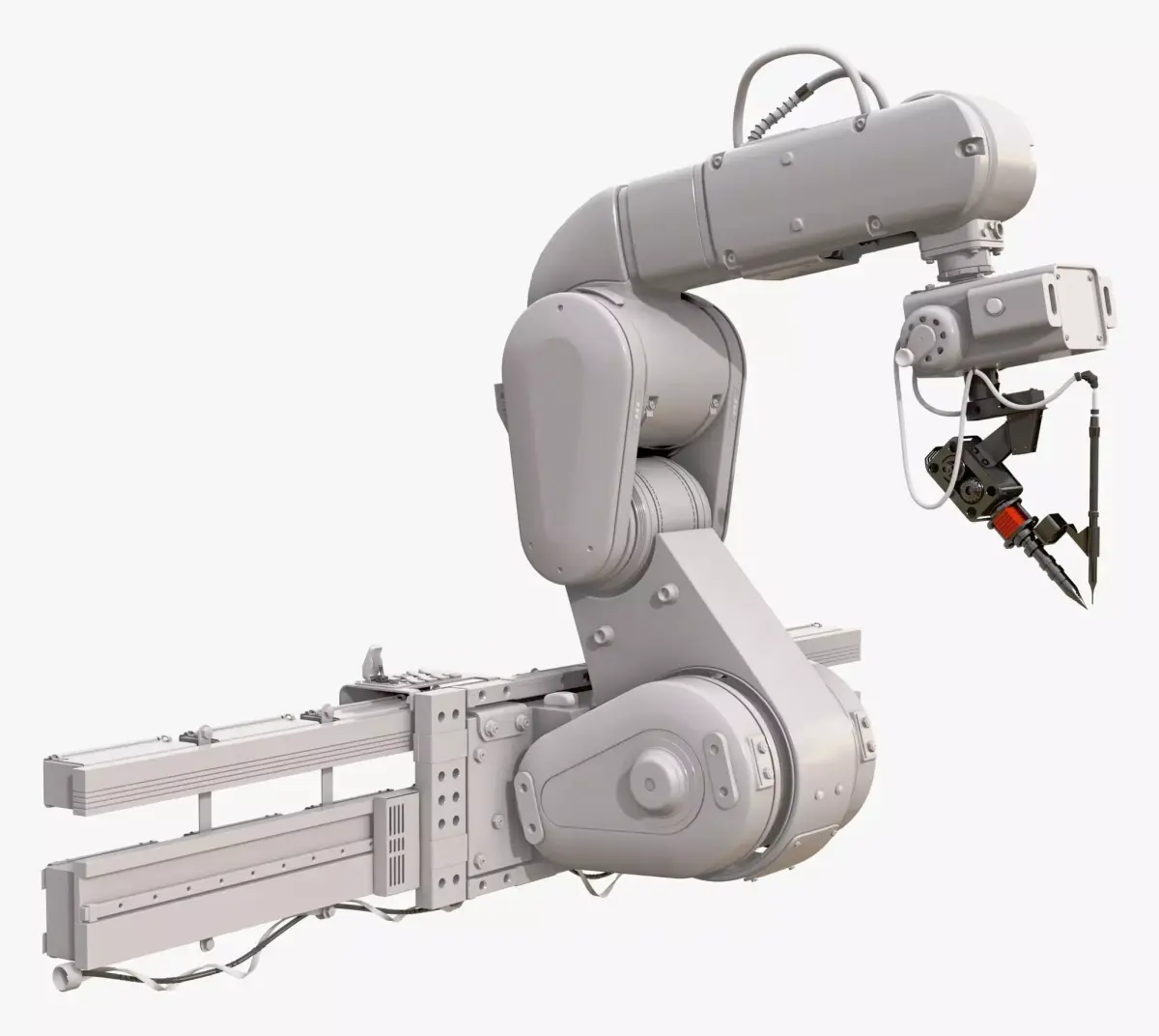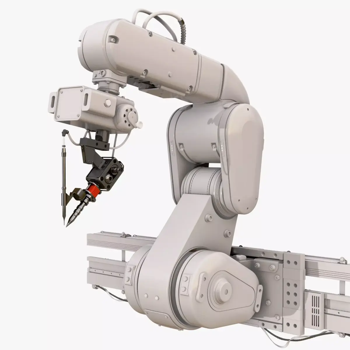 Industrial articulated robot arm mounted on a linear rail system, equipped with a precision tool head for technical operations.