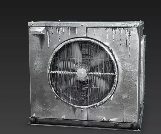 Massive Cooling Fan The front face features a large, circular wire grill protecting a heavy industrial fan blade inside. This detail gives the model a functional face and adds mechanical depth to the boxy shape.