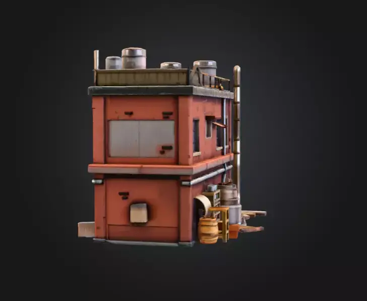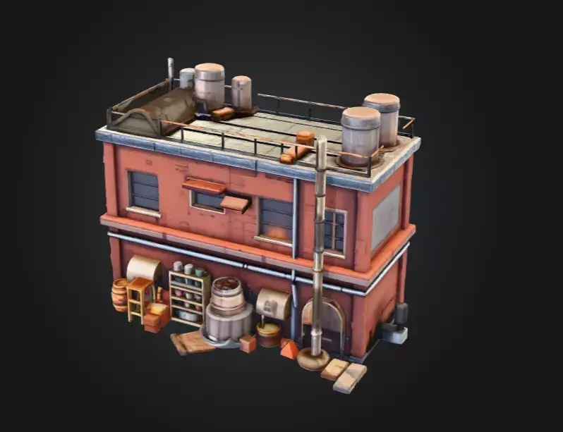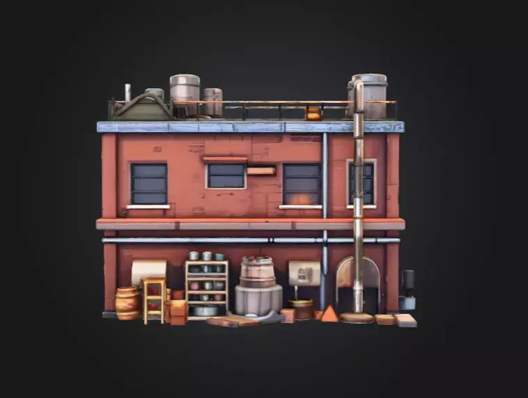 The building’s PBR textures highlight the contrast between worn metal, aged bricks, and subtle paint discoloration, creating a believable stylized realism that fits seamlessly in cartoon, dieselpunk, or cinematic environments. From the rooftop railings and water tanks to the stacked crates, barrels, and storage drums, every asset in this scene has been optimized for both performance and visual fidelity.