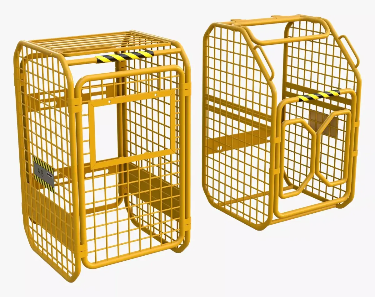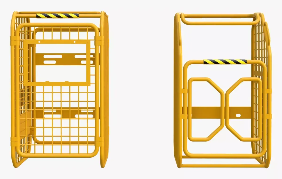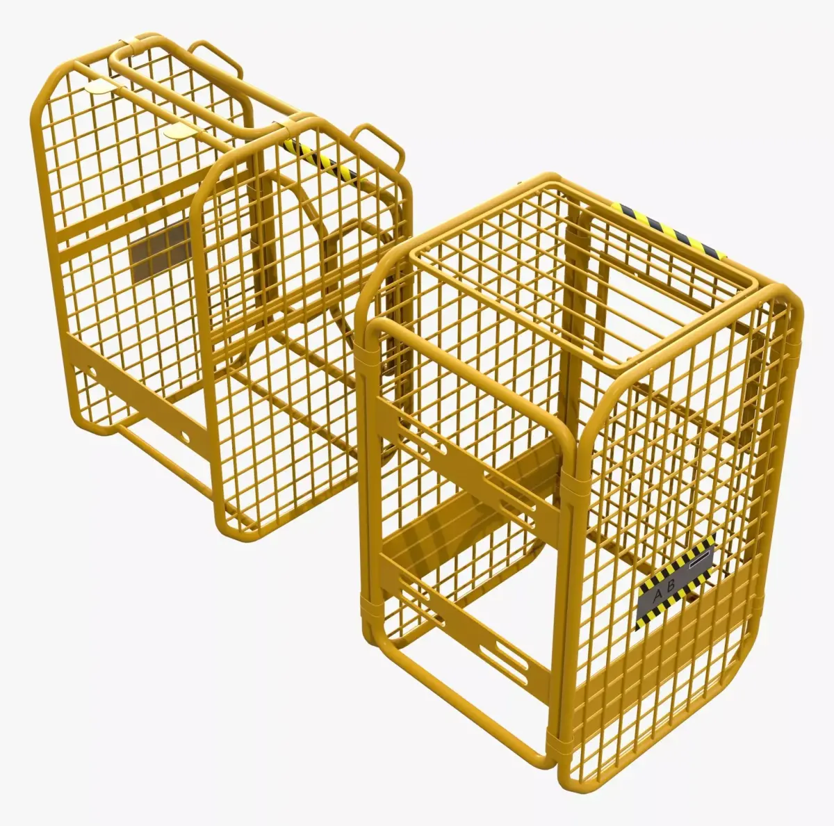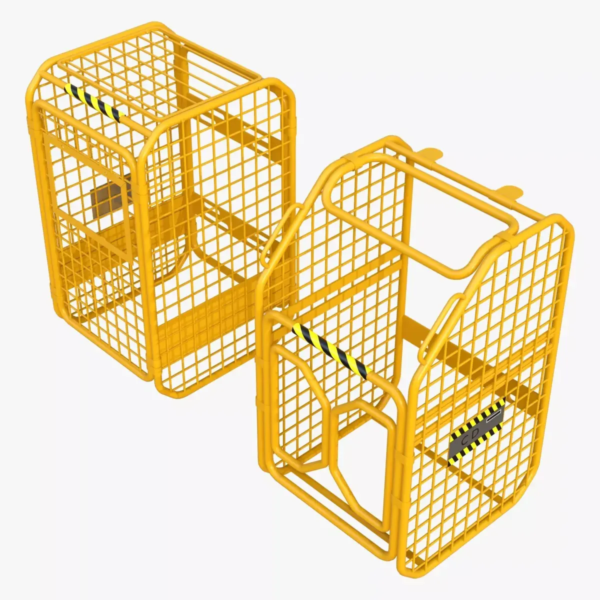 Set of two yellow industrial safety cages made of tubular frames and welded mesh. The models differ structurally: one features a hinged door, while the other is stationary. Black and yellow hazard stripes mark the top bars and plates.