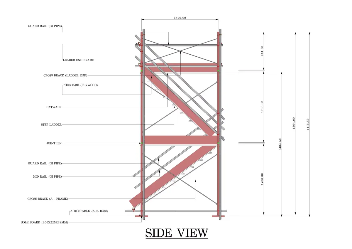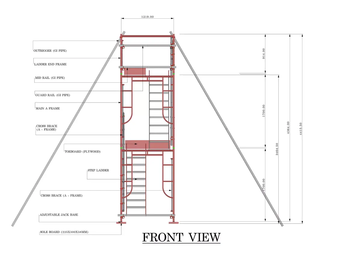 The model includes detailed components such as main A-frames, cross braces, step ladders, catwalk platforms, guard rails, mid rails, toe boards, adjustable jack bases, and stabilizing GI pipe outriggers to ensure structural stability and worker safety.
