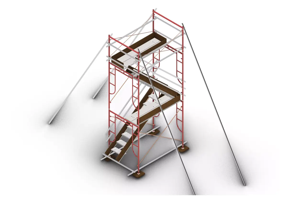 This 3D model represents a scaffolding access tower equipped with a staircase, working platform, guard rails, and stabilizing outriggers. The structure is designed for safe access to elevated work areas commonly used in construction sites, industrial maintenance, and building inspection tasks.