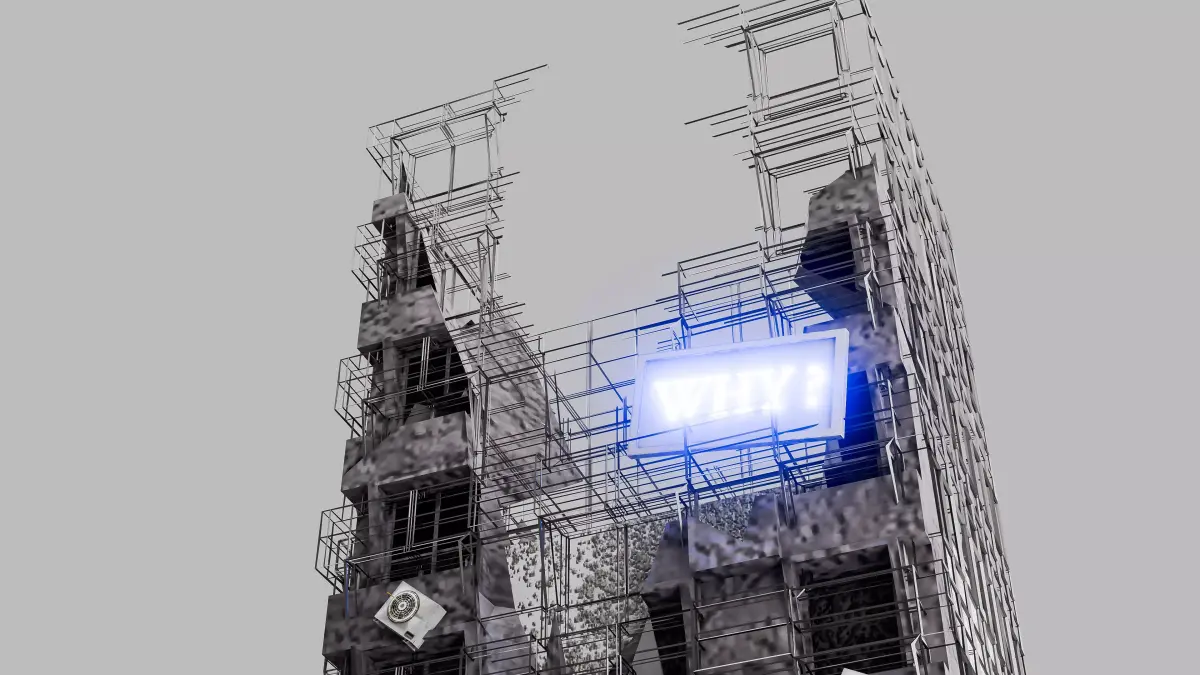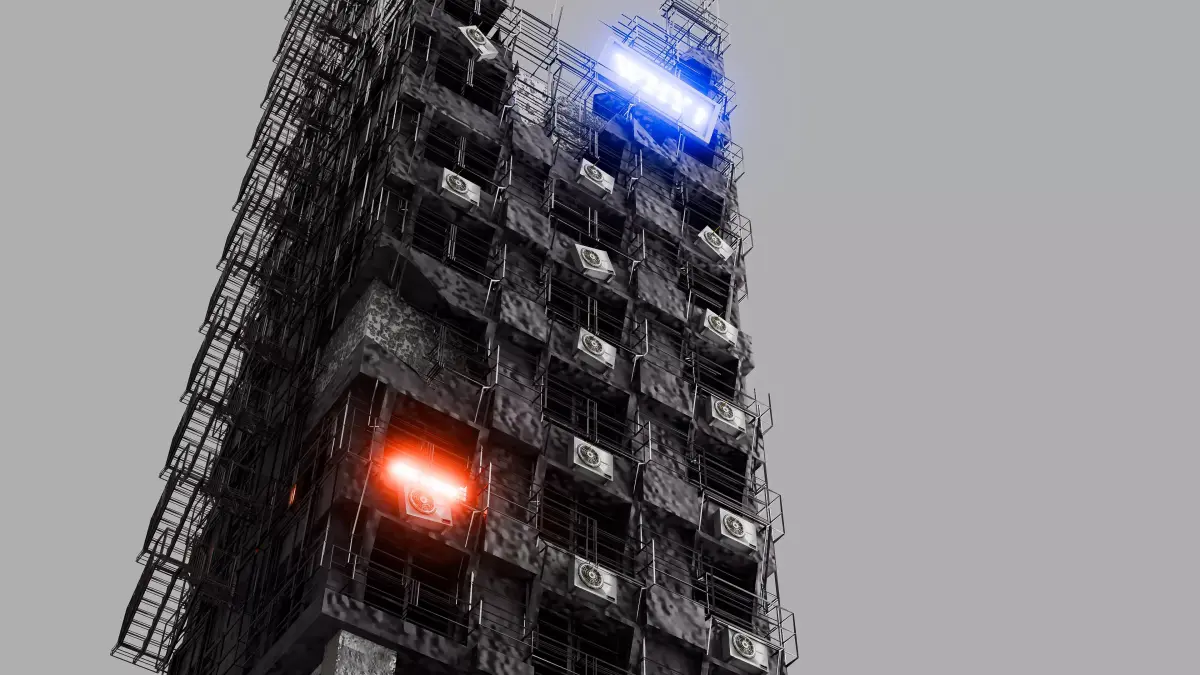 This is a highly detailed dystopian industrial sci-fi tower building created and textured in Blender. The model features realistic surface detail, dense mechanical elements, AC units, scaffolding, and illuminated panels, making it ideal for dark futuristic environments.