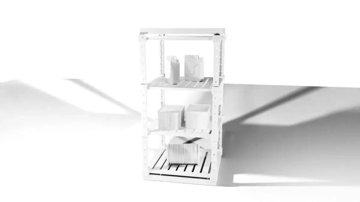 On the middle shelf sit plastic tote containers with slightly beveled lids and subtle structural ridges, stacked neatly to suggest organized storage. The bottom shelf holds a large spool of heavy-duty wire, with the wire tightly wrapped around a simple cylindrical core and minimal edge loops to maintain the low-poly aesthetic while preserving a believable silhouette. Nearby are durable gas cans, modeled with recognizable handles, spouts, and compact geometry to keep the asset optimized. A balanced composition gives the shelving unit a believable load distribution.