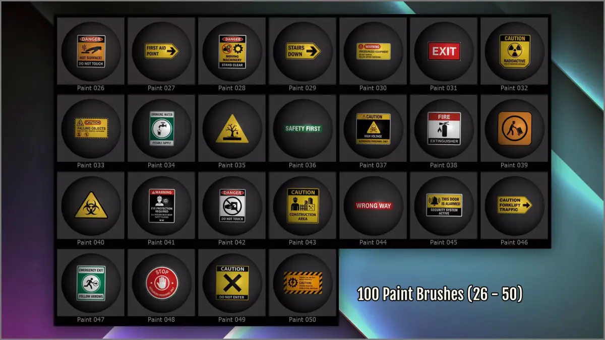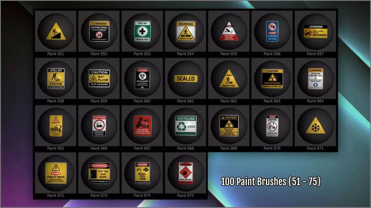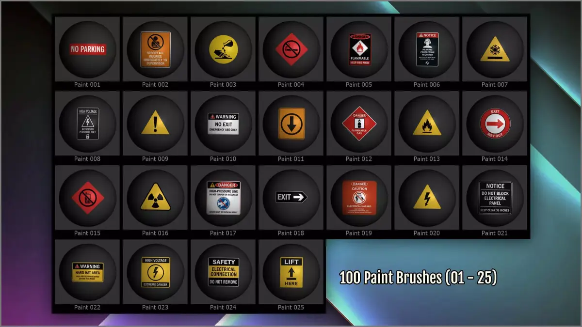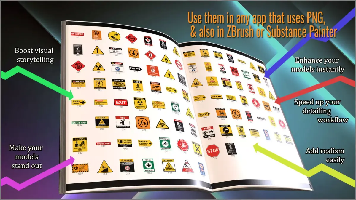 Get this megapack of 100 Industrial Sign Decals in PNG for any graphics editor, plus brushes for ZBrush and files for Substance Painter or any 3D painting app.