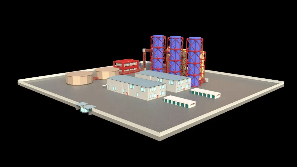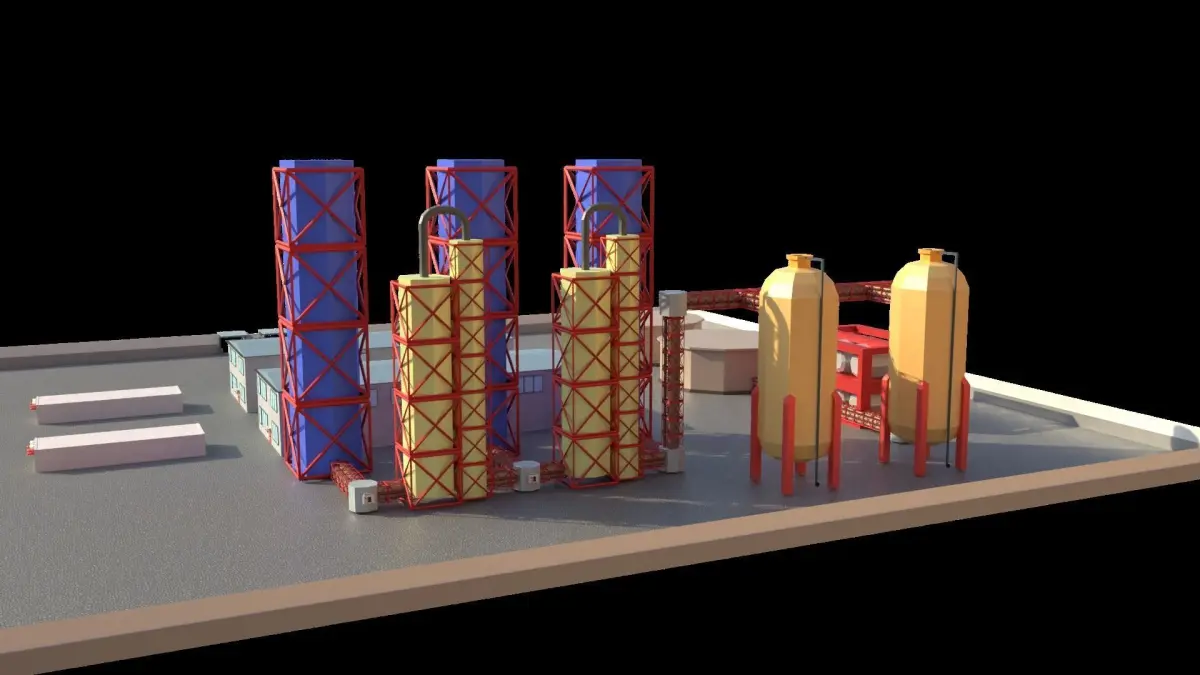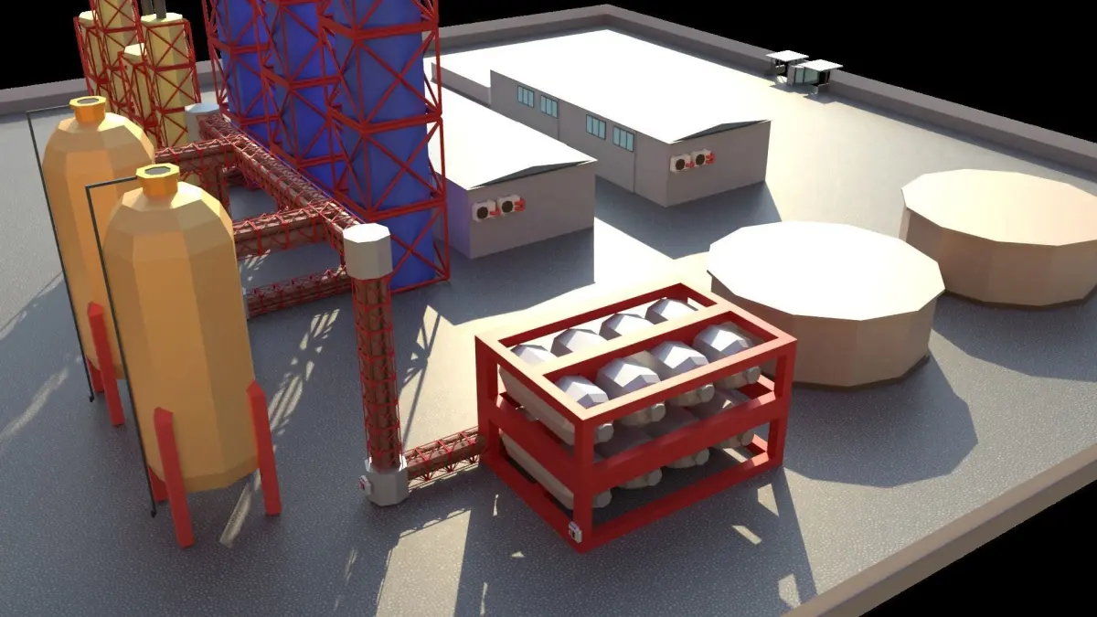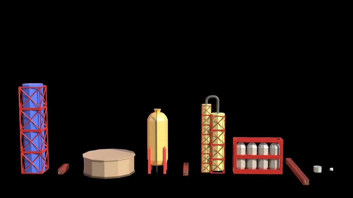 Little pack of props for modelling an industrial site with silo, barrel, pillar, parking, building of research,...