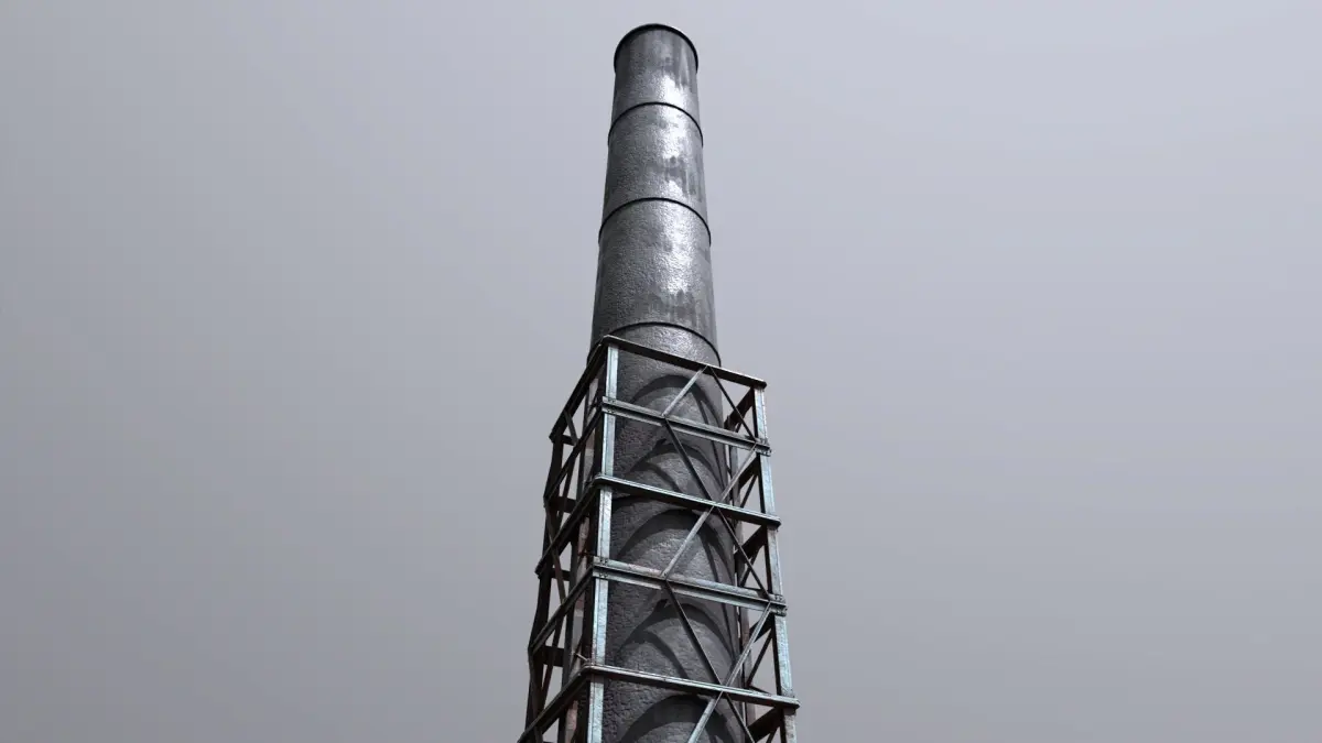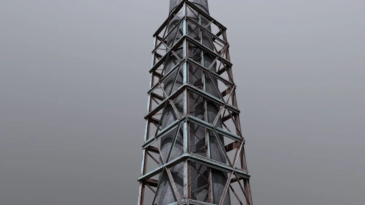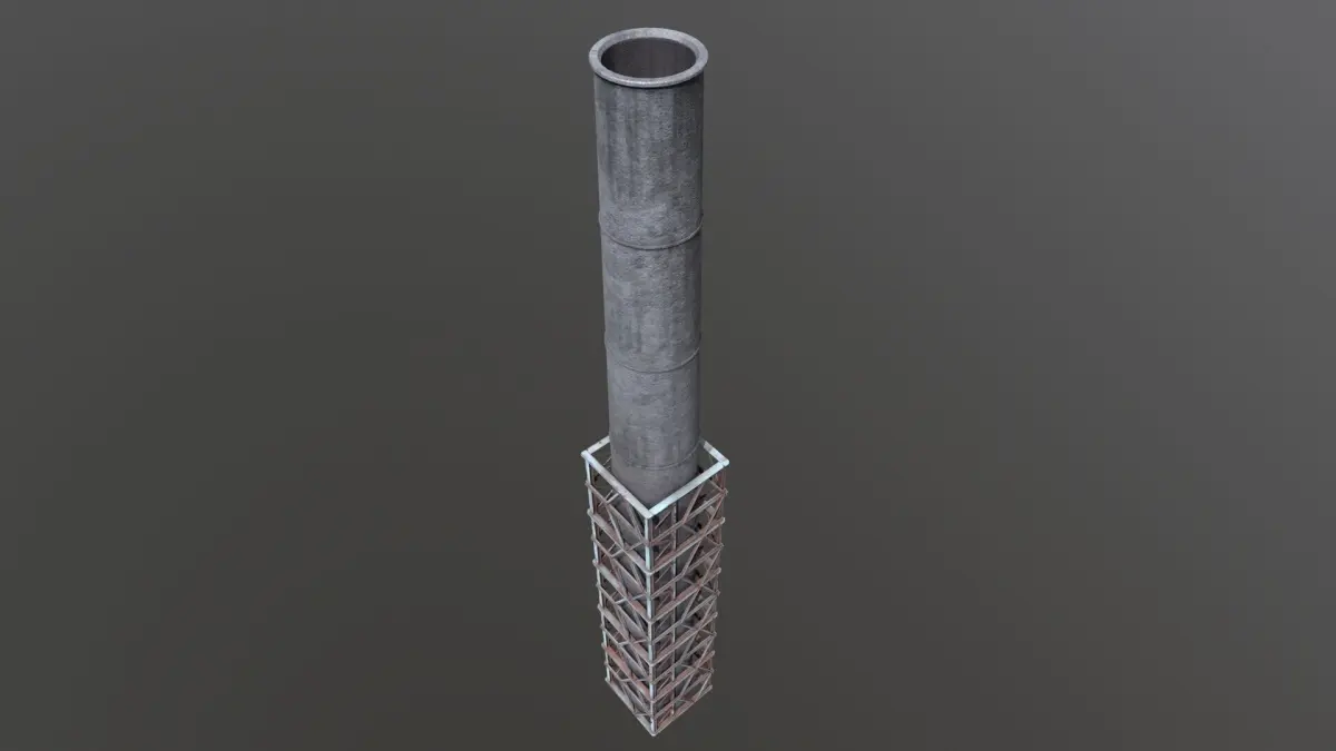 This detailed 3D model features a towering industrial smokestack reinforced with a weathered steel support structure. Designed for high-impact visual storytelling in post-apocalyptic, factory, or dystopian environments, the asset is ideal for use in games, cinematics, and simulations.