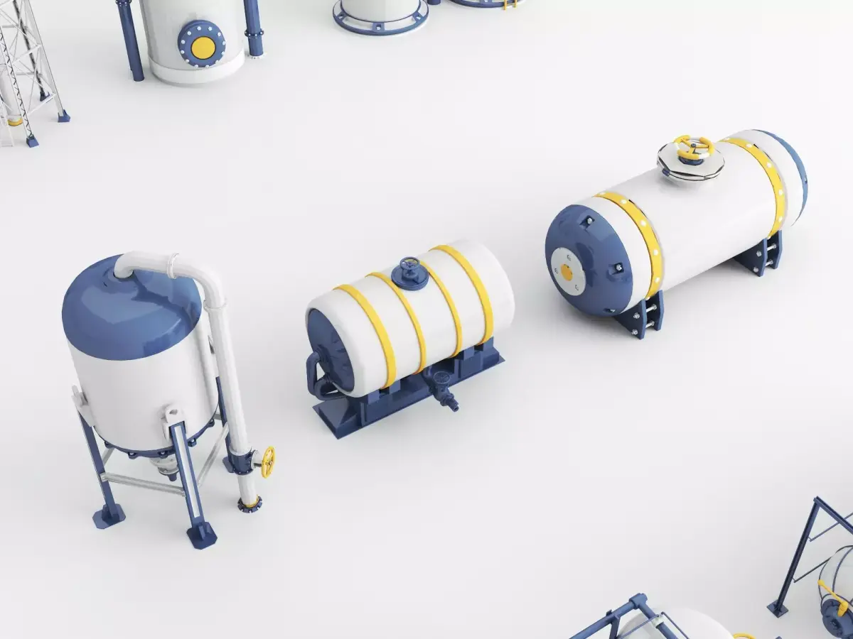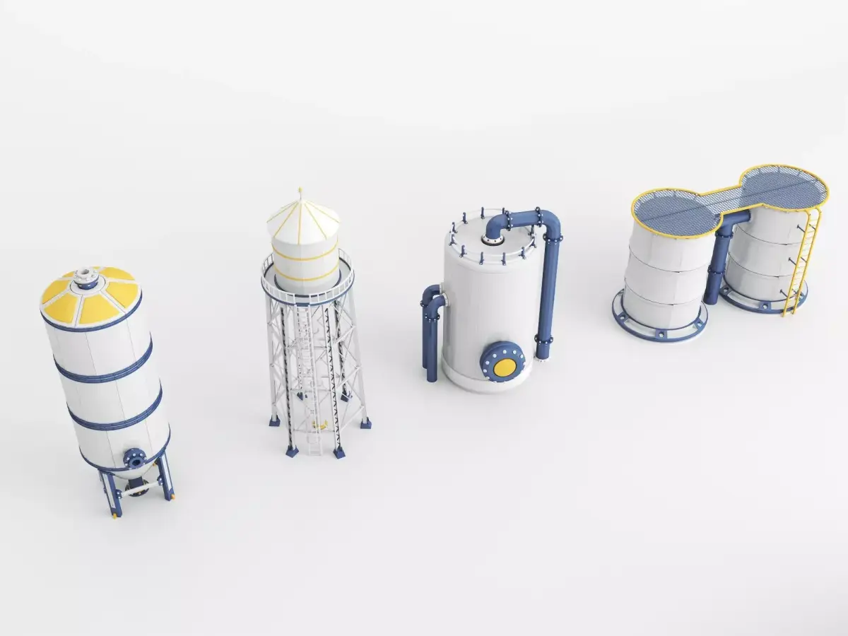 This high-quality 3D model pack includes a variety of industrial storage tanks, silos, and pressure vessels in different shapes and configurations, featuring blue, white, and yellow color schemes with detailed piping and supports. Perfect for factory scenes, engineering visualizations, or oil and gas industry renders. Contains 8 unique models with clean topology, compatible with Blender, Maya, or Unity.