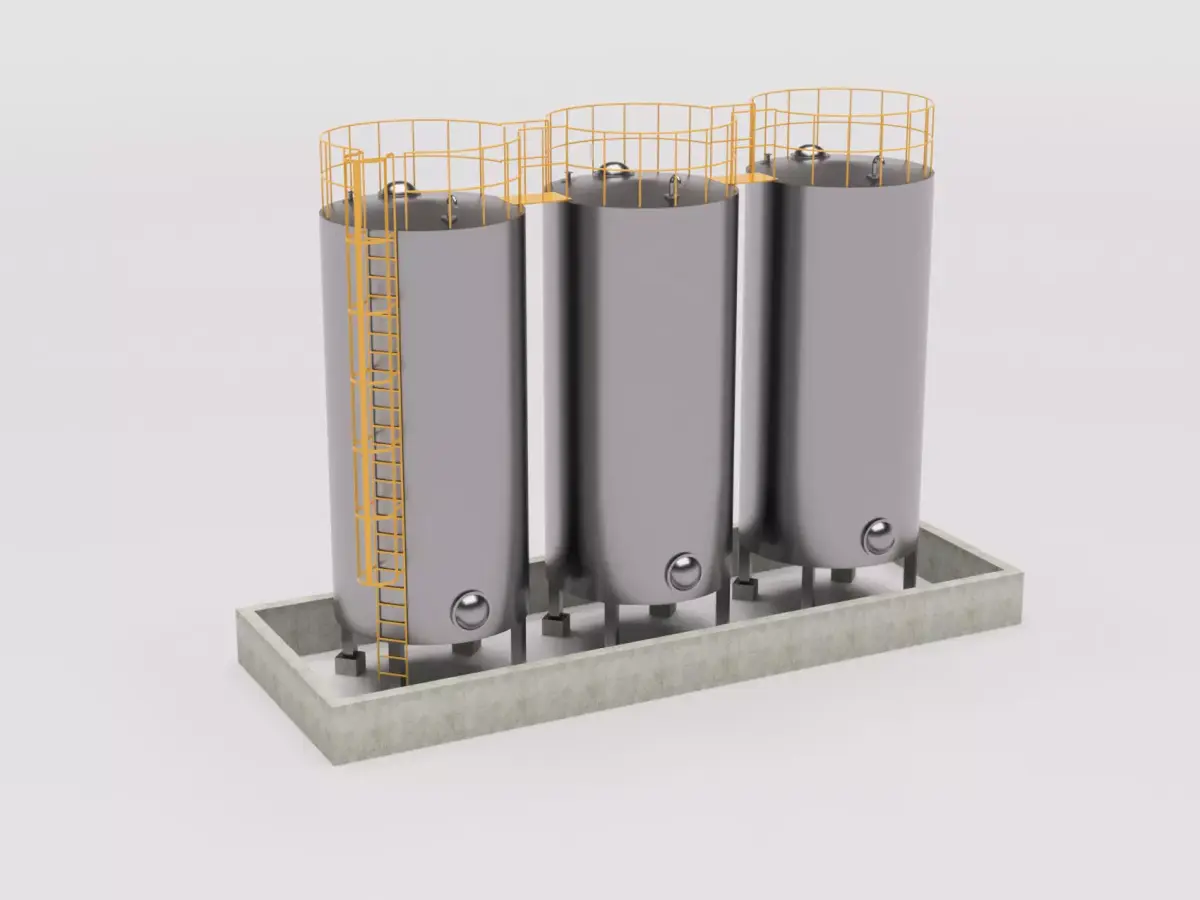 Industrial Storage Tanks – Vertical Steel Tank System is a conceptual 3D model of a set of three vertical industrial storage tanks, commonly used in oil, chemical, water, and process industries.