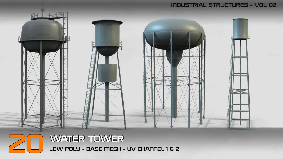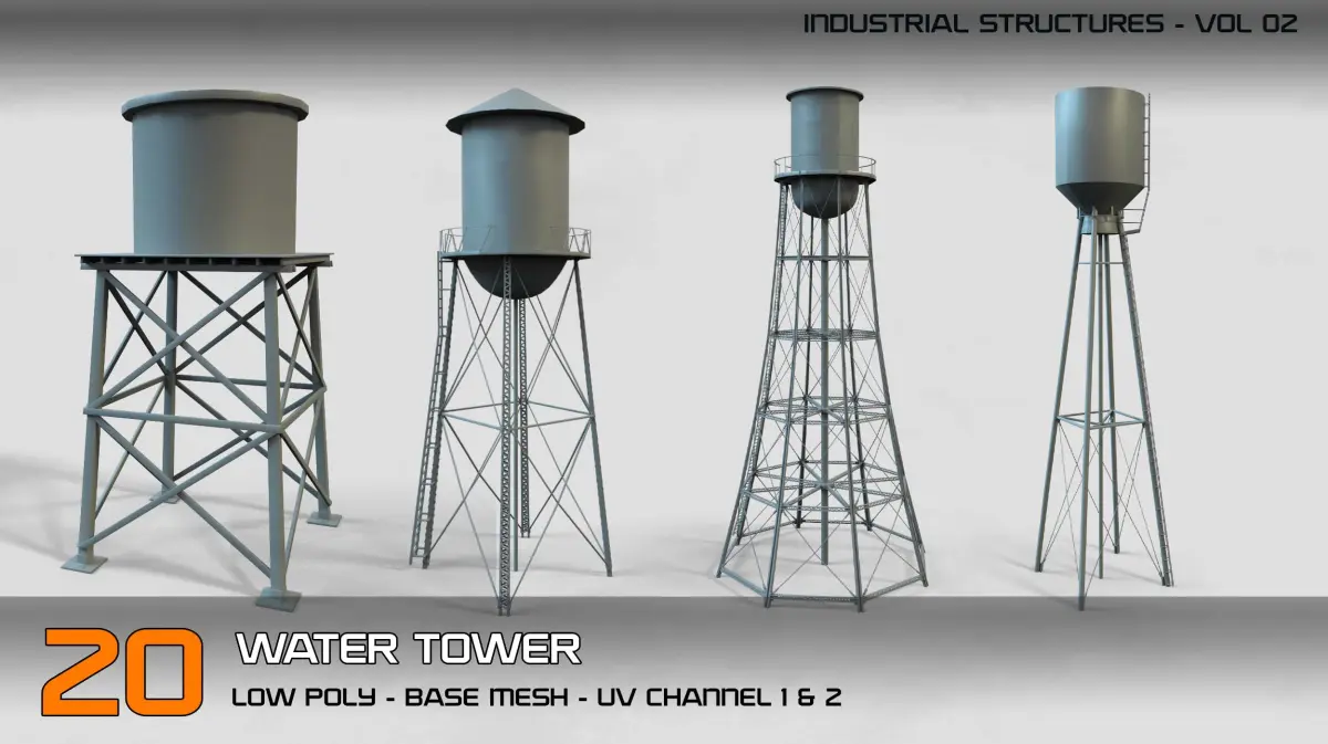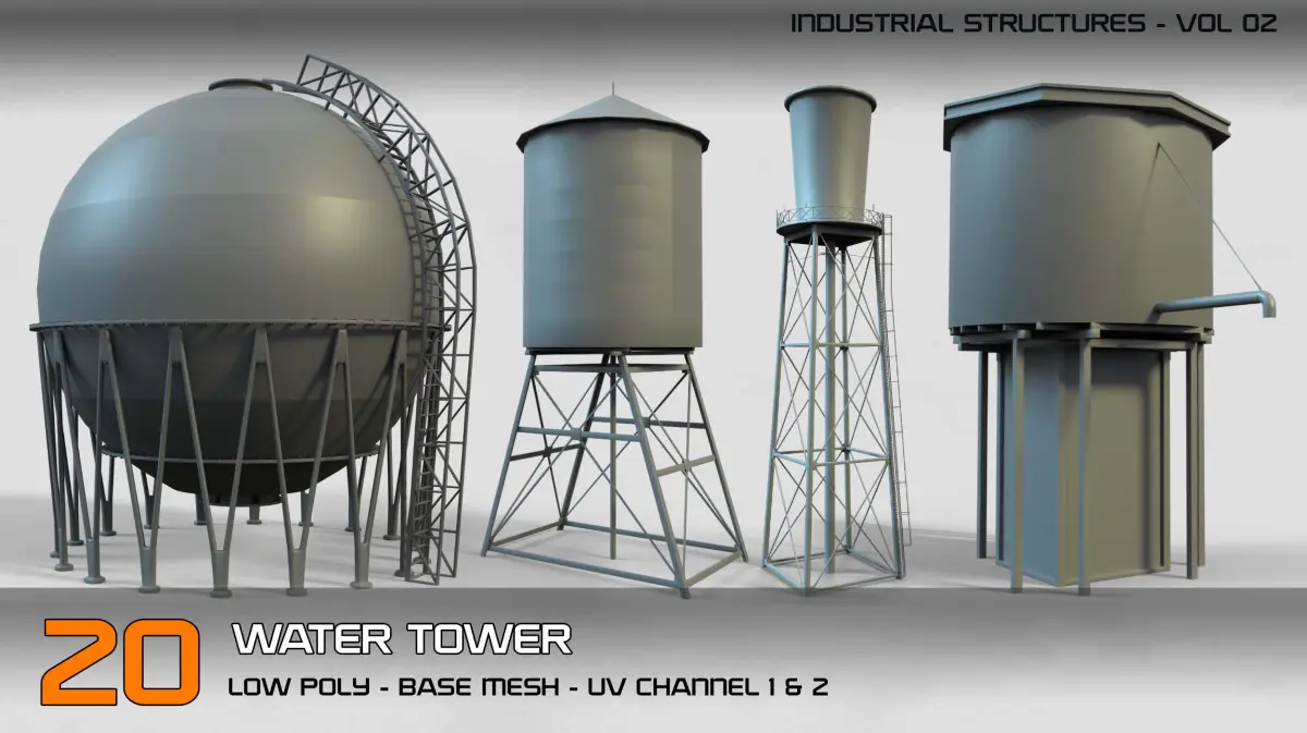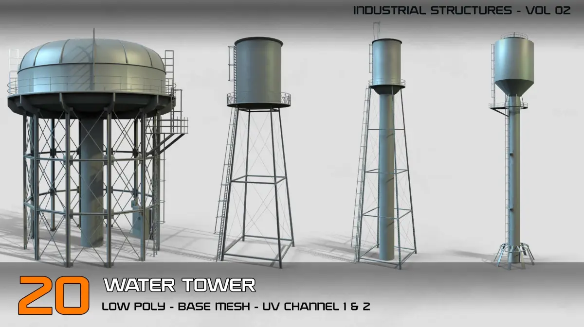 Industrial Structures- vol 2 – 20 Water Tower Structure (Game Ready-Low Poly)