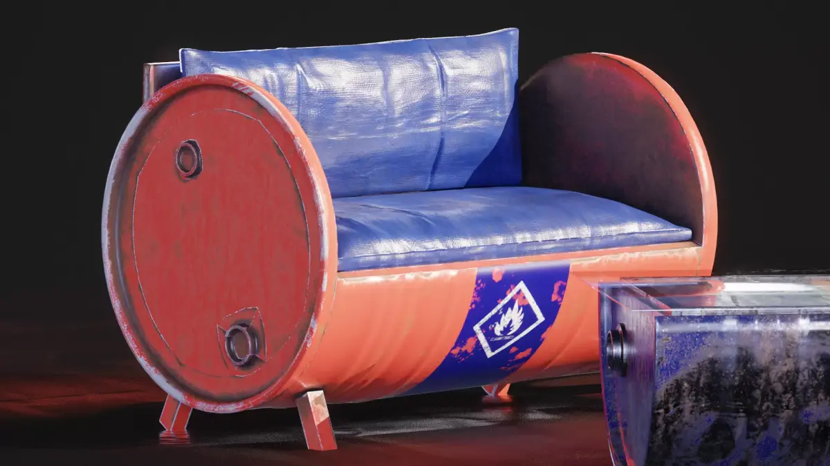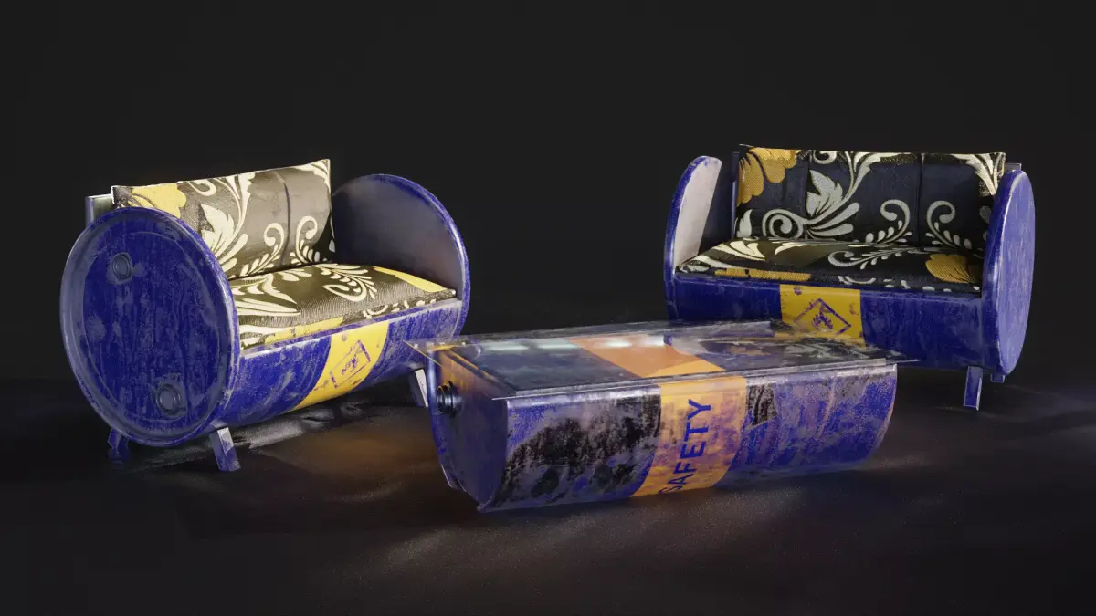 This is a detailed 3D furniture set created from repurposed metal barrels, designed with a creative industrial style.The set includes two barrel sofas and a matching coffee table, all modeled with realistic materials, textures, and wear details.Perfect for industrial, post-apocalyptic, or urban interior scenes.Features:Clean topology and optimized meshPBR materials (Base Color, Roughness, Metalness, Normal, AO)Realistic UV mappingReady for rendering in Blender, Unreal Engine, or any PBR-compatible softwareFile formats: .blend, .fbx, .obj (adjust if needed)Usage:Ideal for environment design, game assets, animation scenes, or concept art.