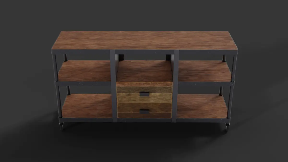 Crafted from reclaimed wood and metal, this industrial-style media console exudes rugged charm. It showcases a distressed black finish with a textured surface. Modelling in Blender. Textured in Substance Painter.