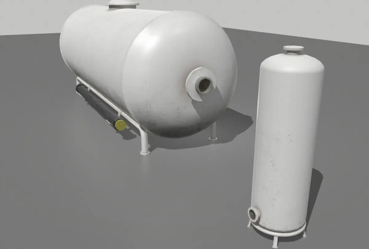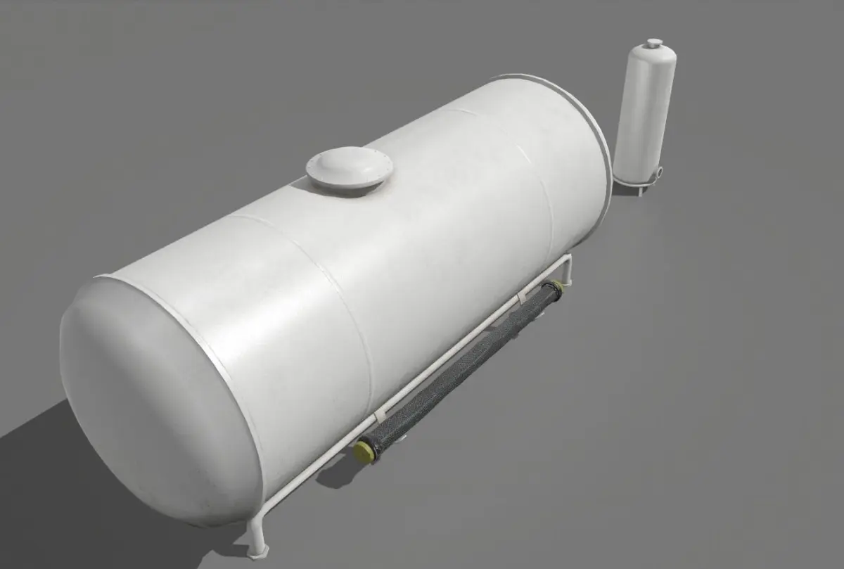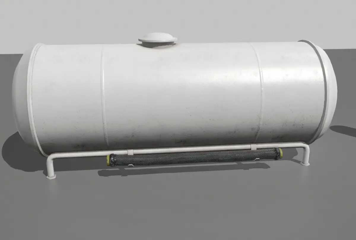 Realistic scale. For exterior and interiors. Support legs and hose are separate objects in case you want to use the tank alone.
